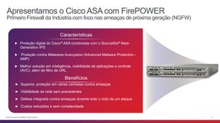 O Cisco ASA com Firepower é pioneiro na indústria de firewalls de próxima geração (NGFW), oferecendo proteção integral contra ameaças avançadas e visibilidade sem precedentes. Combina recursos como Inteligência de Segurança, Controle de Aplicações e Proteção Avançada contra Malware para defender redes durante todo o ciclo de um ataque. Sua implementação promete reduzir custos e complexidade ao fornecer uma abordagem de defesa integrada e automatizada contra vulnerabilidades.