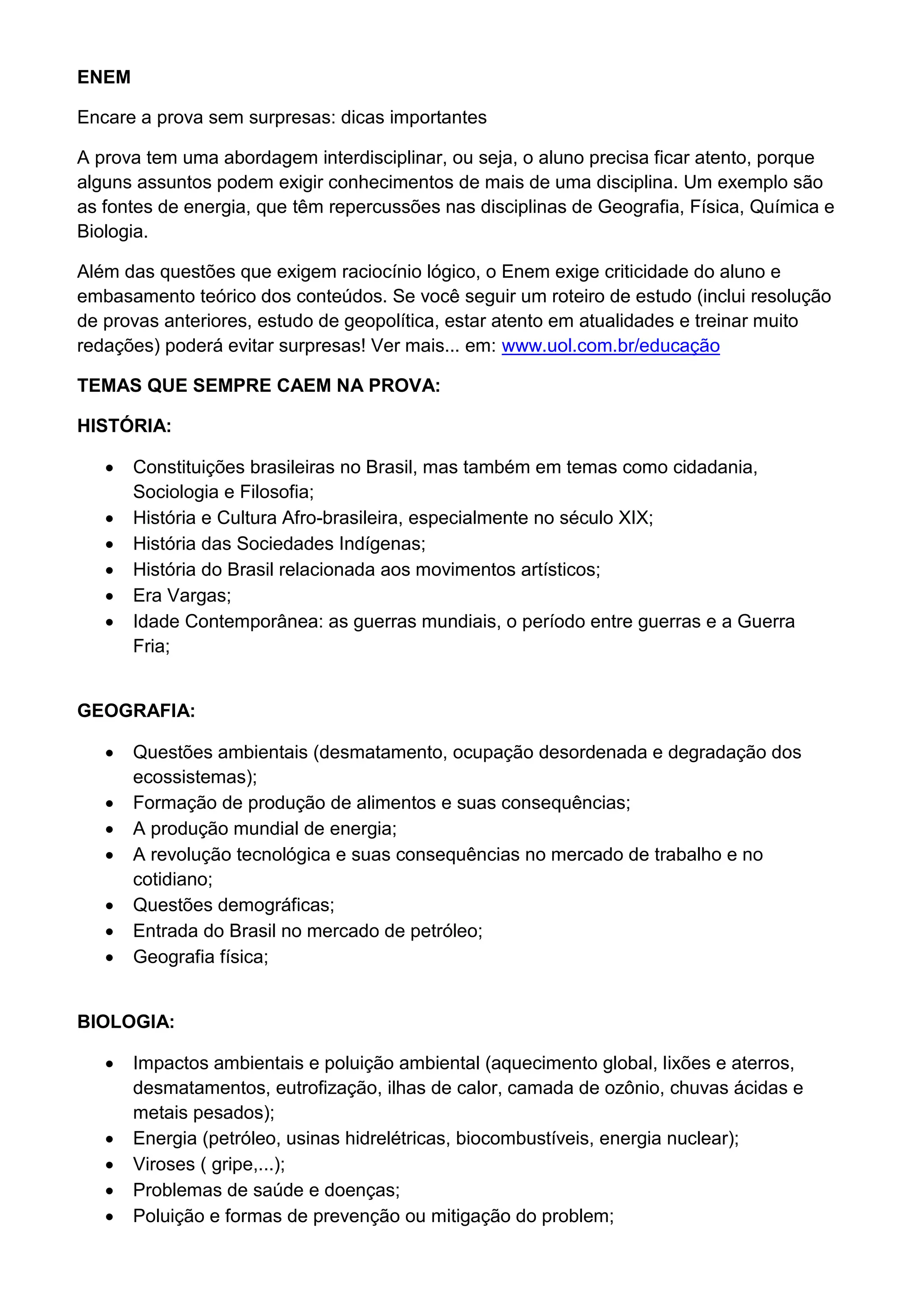 O documento fornece dicas para estudantes do ENEM, enfatizando que a prova exige conhecimentos interdisciplinares e pensamento crítico. Também lista os temas que costumam aparecer com mais frequência em cada disciplina, como história do Brasil, questões ambientais em geografia e biologia, e cálculos e energia em química e física. Por fim, detalha as competências avaliadas na redação do ENEM.