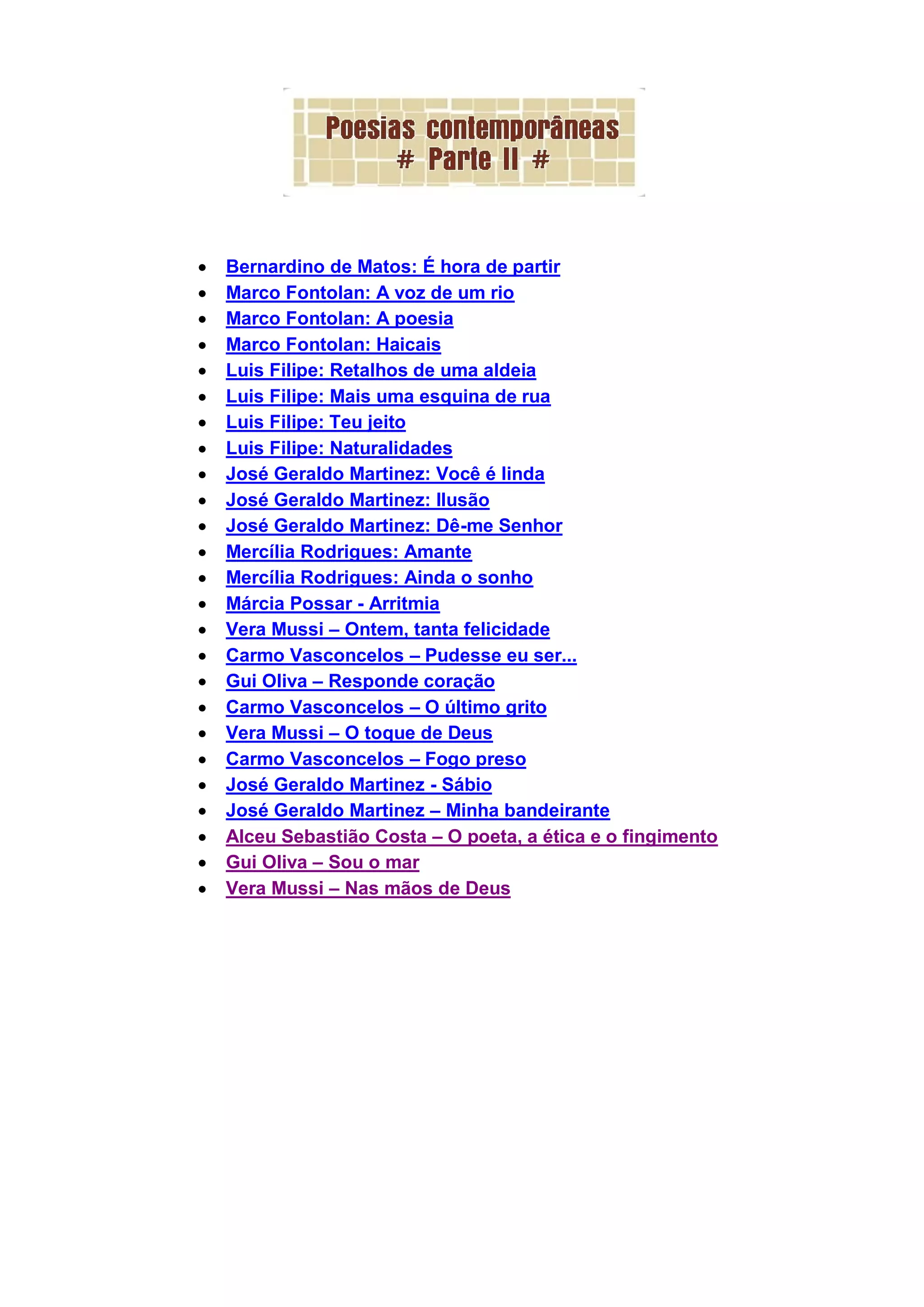 Este documento contém vários poemas de diferentes autores em português. Os poemas abordam temas como amor, natureza, beleza feminina, saudade, e aspectos da vida rural e da aldeia portuguesa.