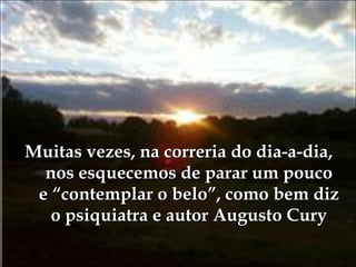 A autora descreve como a contemplação da beleza da natureza, especialmente os pôr-do-sols, a ajudou a se curar da depressão. Hoje ela procura ensinar seu filho a valorizar as pequenas coisas da vida, como tirar uma foto de um pôr-do-sol, para que ele possa ser feliz. Ela incentiva o leitor a fazer passeios com a família para apreciar a natureza e acreditar que Deus os ama.