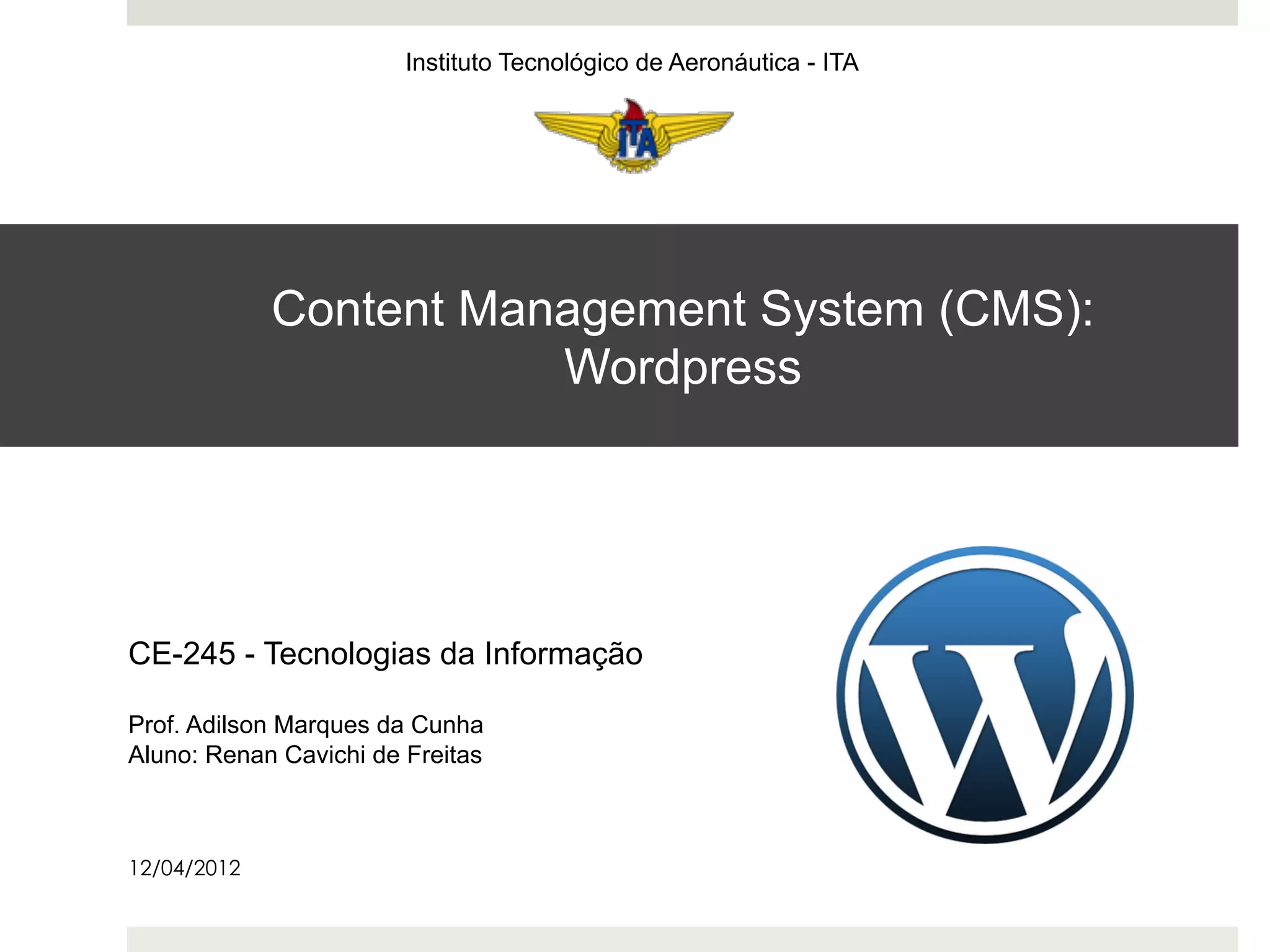 O documento fornece um resumo sobre o Content Management System (CMS) Wordpress. Ele descreve os principais recursos do Wordpress, sua popularidade e market share, além de recomendar o uso do Wordpress para sites de blogs e notícias devido à sua estrutura flexível e grande comunidade de desenvolvedores.