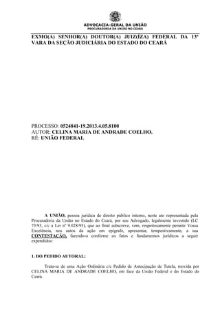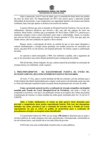 A União alega que não é responsável pela realização direta de ações e serviços de saúde, como a cirurgia ortopédica requerida pela autora, sendo essa atribuição dos estados e municípios. Defende, portanto, sua ilegitimidade passiva na ação e que o Estado do Ceará e Município de Fortaleza devem ser partes no processo.