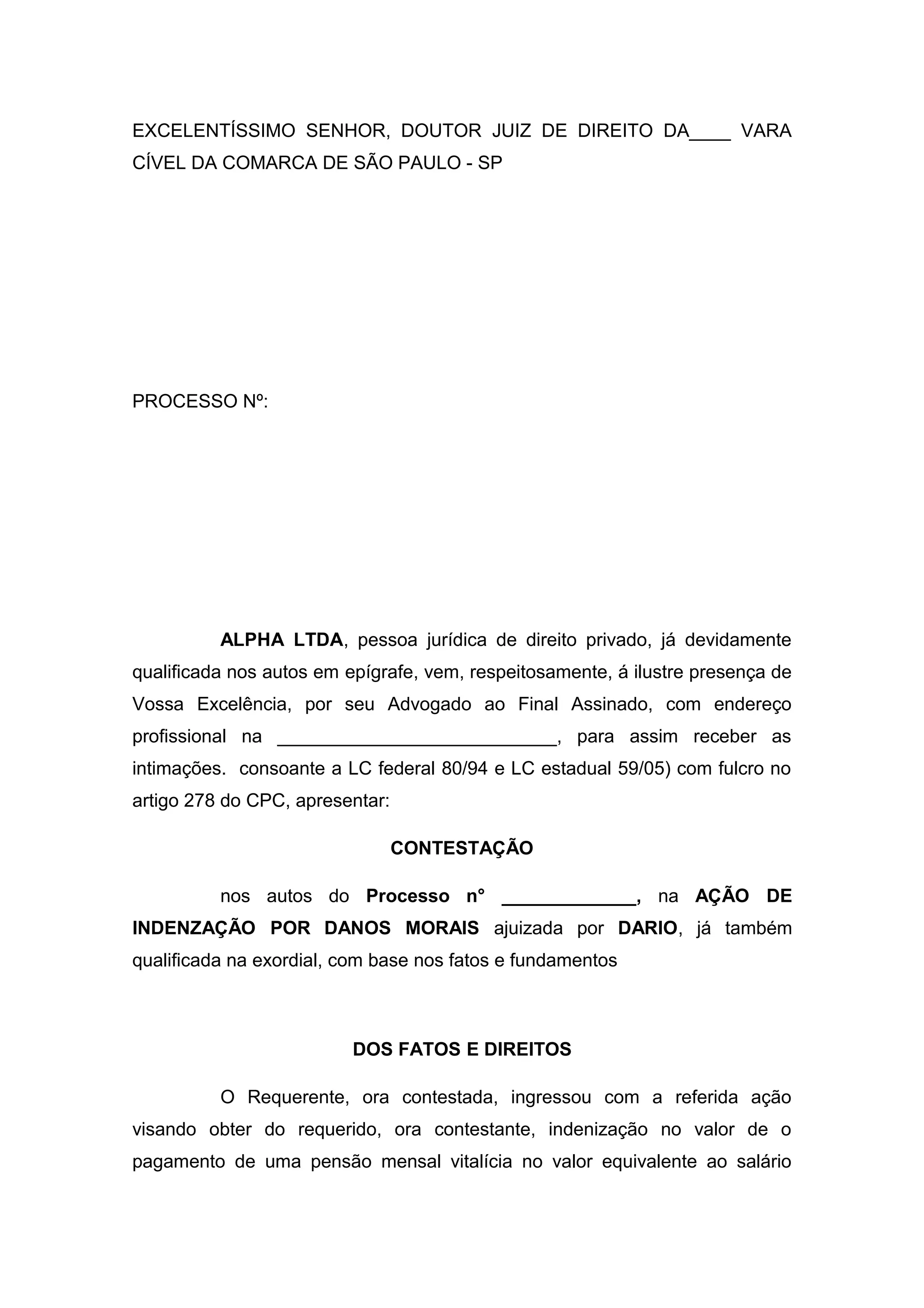 A empresa Alpha Ltda contesta a ação de indenização por danos morais movida por Dario. A empresa argumenta que Dario já era surdo antes de trabalhar para a Alpha e que seu problema de audição foi causado pelos 10 anos trabalhando no aeroporto, onde havia alto nível de barulho, e não durante o período trabalhando para a Alpha. A empresa também alega que a ação deveria ter sido movida na esfera trabalhista e não na vara cível.