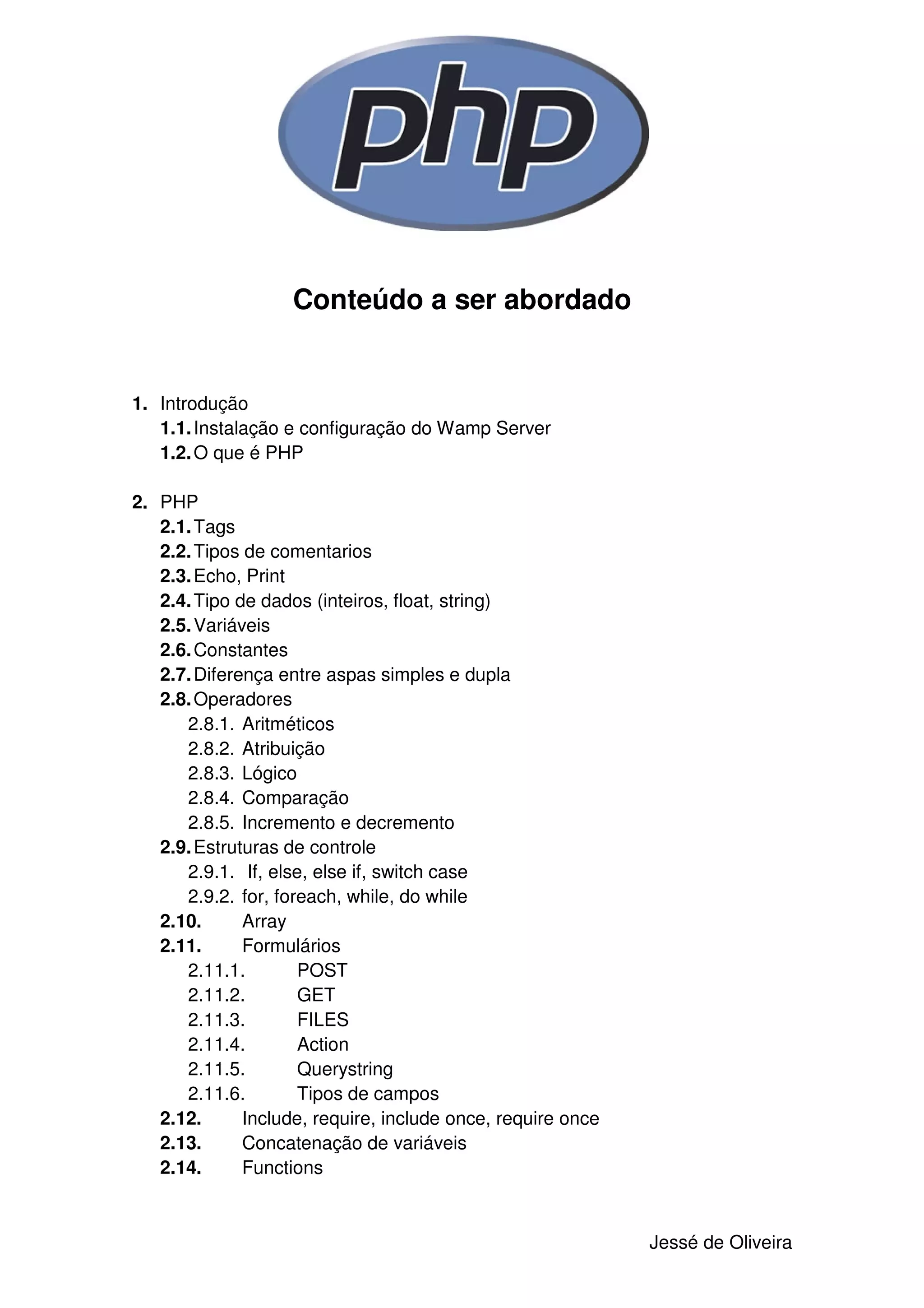 O documento apresenta um curso completo de PHP, abordando tópicos como sintaxe básica, variáveis, arrays, funções, manipulação de arquivos e banco de dados, desenvolvimento web com PHP e MySQL, programação orientada a objetos e segurança contra SQL injection.