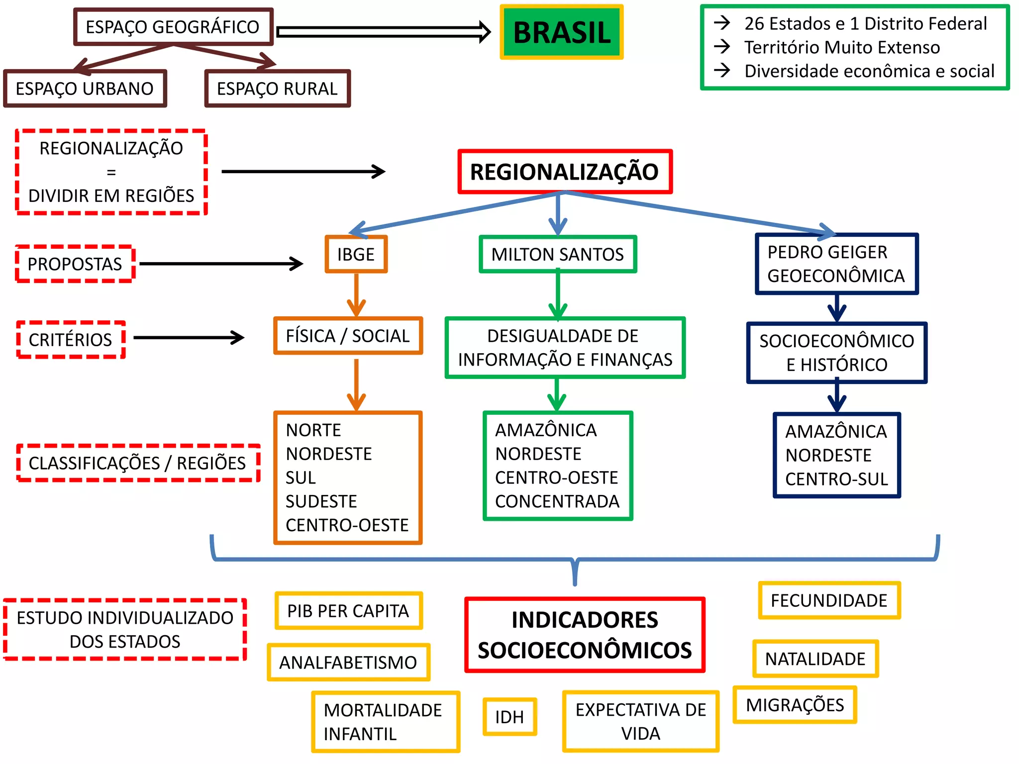 O documento discute a regionalização do Brasil, que é dividido em cinco grandes regiões - Norte, Nordeste, Centro-Oeste, Sudeste e Sul - com base em critérios físicos, socioeconômicos, históricos e desigualdades regionais. Dentro dessas regiões, existem sub-regiões como a Amazônica e o Nordeste, que apresentam características próprias quando analisados indicadores como IDHM, taxa de natalidade, analfabetismo e PIB per capita.