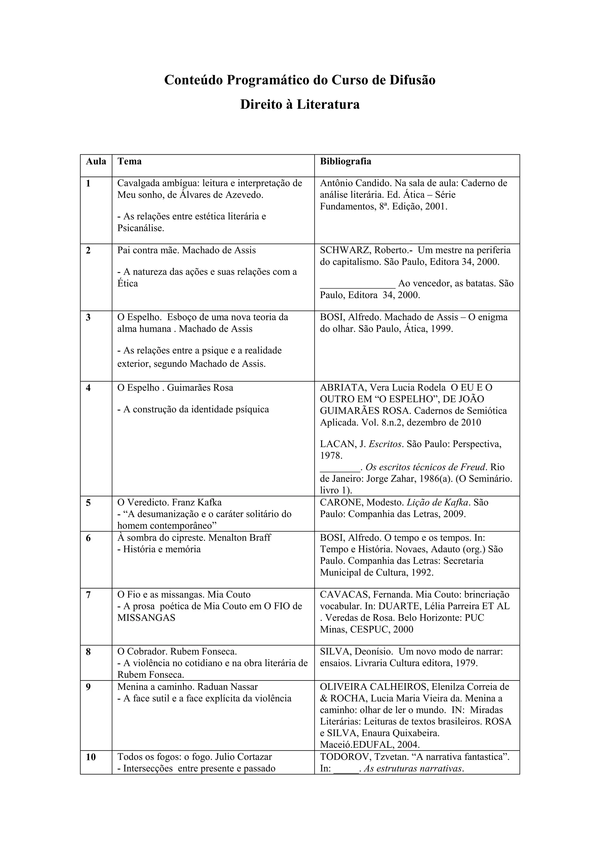 1. O documento apresenta um programa de conteúdo para um curso de difusão de literatura, com 12 aulas abordando obras literárias de diversos autores brasileiros.
