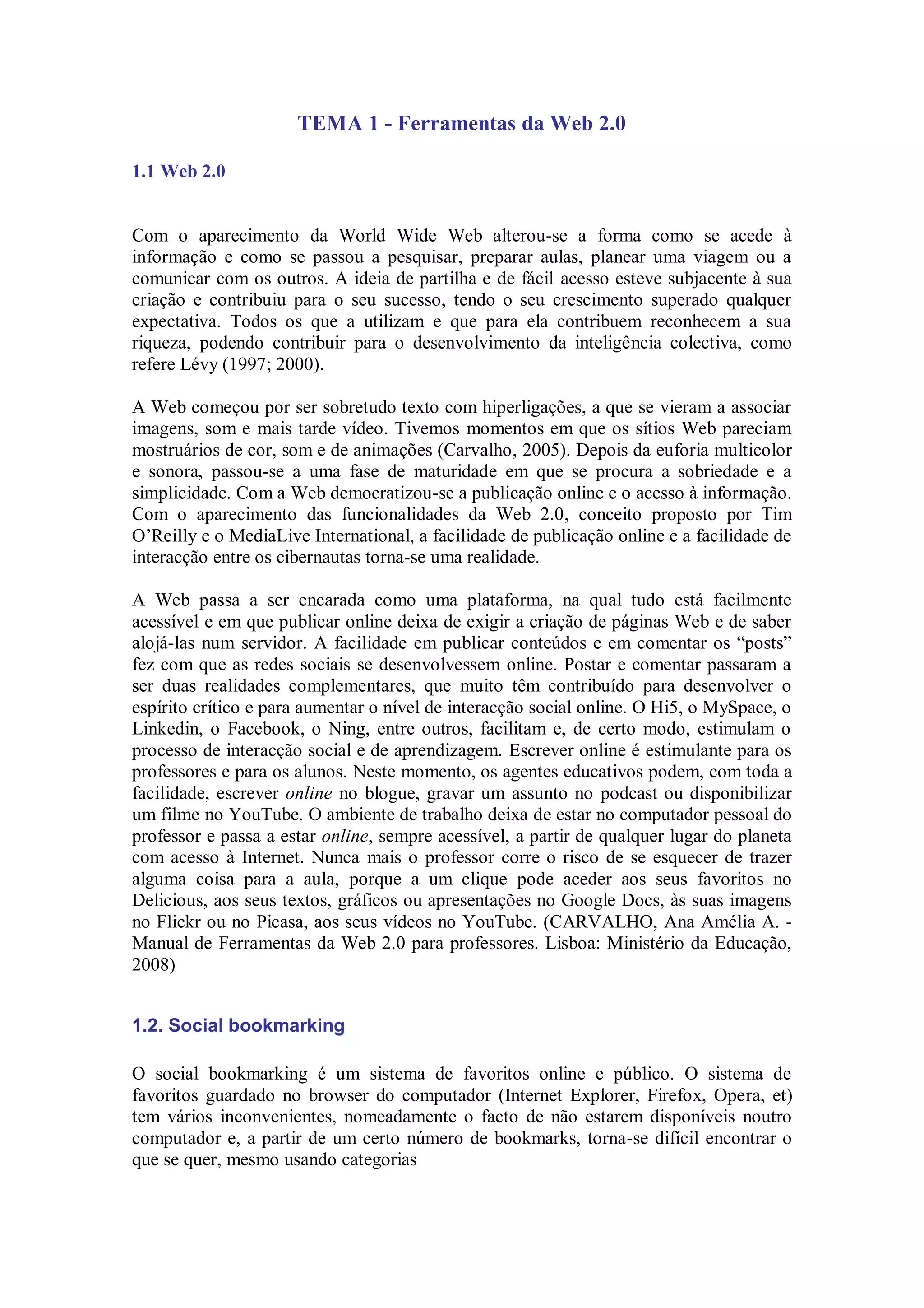 Este documento discute as ferramentas da Web 2.0. Apresenta o conceito de Web 2.0 e como facilitou a publicação e interação online. Também descreve várias ferramentas populares como redes sociais, bookmarking social, YouTube e blogs, explicando suas funcionalidades e como podem ser usadas para educação.