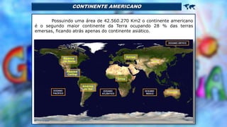 O documento descreve o continente americano, dividido em quatro regiões: América Latina, América Anglo-Saxônica, América Platina e América Andina. O continente possui 42,5 milhões de km2 e é dividido em América do Norte, América Central e América do Sul. Apresenta climas polar, temperado e tropical, exceto a Antártica.