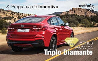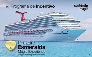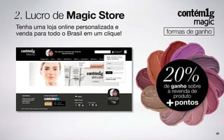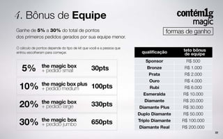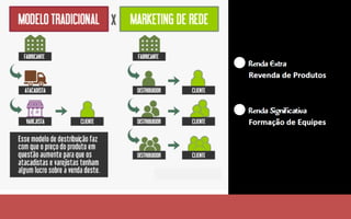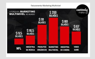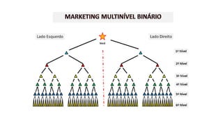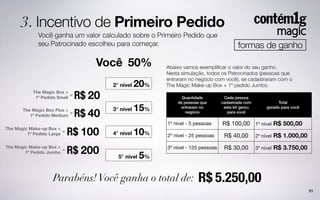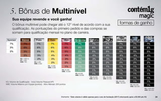 O documento descreve um plano de negócios de marketing multinível, com diferentes níveis de patrocínio que rendem porcentagens crescentes de comissões. O plano estima que após um ano, a equipe de marketing direta e indireta do participante poderia alcançar 8.190 pessoas, gerando rendimentos mensais de até R$30.000.