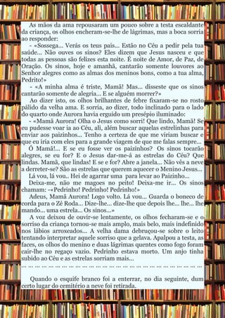 3) À medida que Pedrinho piora, ele pede para ir ao céu buscar estrelas para seus pais, até falecer. Os sinos tocam suavemente em sua homenagem.
