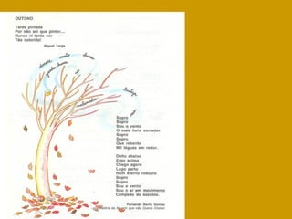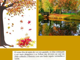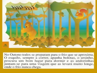 O documento conta a história de Pedro, que passa o fim de semana na casa do tio Joaquim, guarda florestal, para ver de perto como é o outono. Pedro ajuda vários animais da floresta a se prepararem para o inverno, como um esquilo que perdeu sua toca e uma andorinha atrasada para a migração. Pedro aprende sobre como a floresta e os animais se preparam para a estação fria.