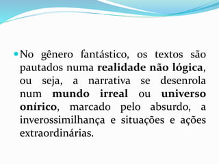 O documento discute o gênero literário do conto fantástico, definindo-o como uma narrativa curta e concisa que mistura elementos fantásticos e reais. Apresenta as origens do gênero no século XVII e seu auge na América Latina no século XX como forma de denúncia política. Também destaca características como a presença de personagens mágicos, realidade ilógica e sensação de estranhamento causada na ruptura entre realidade e ficção.
