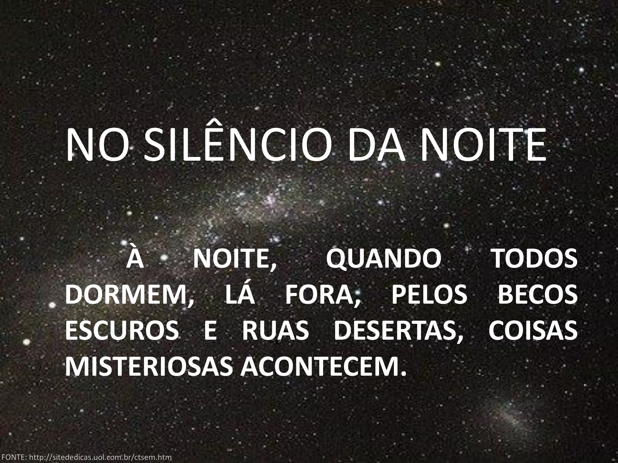 NOITE À NOITE, QUANDO TODOS DORMEM, LÁ FORA, PELOS BECOS ESCUROS E RUAS DESERTAS, COISAS MISTERIOSAS ACONTECEM. FONTE: http://sitededicas.uol.com.br/ctsem.htm