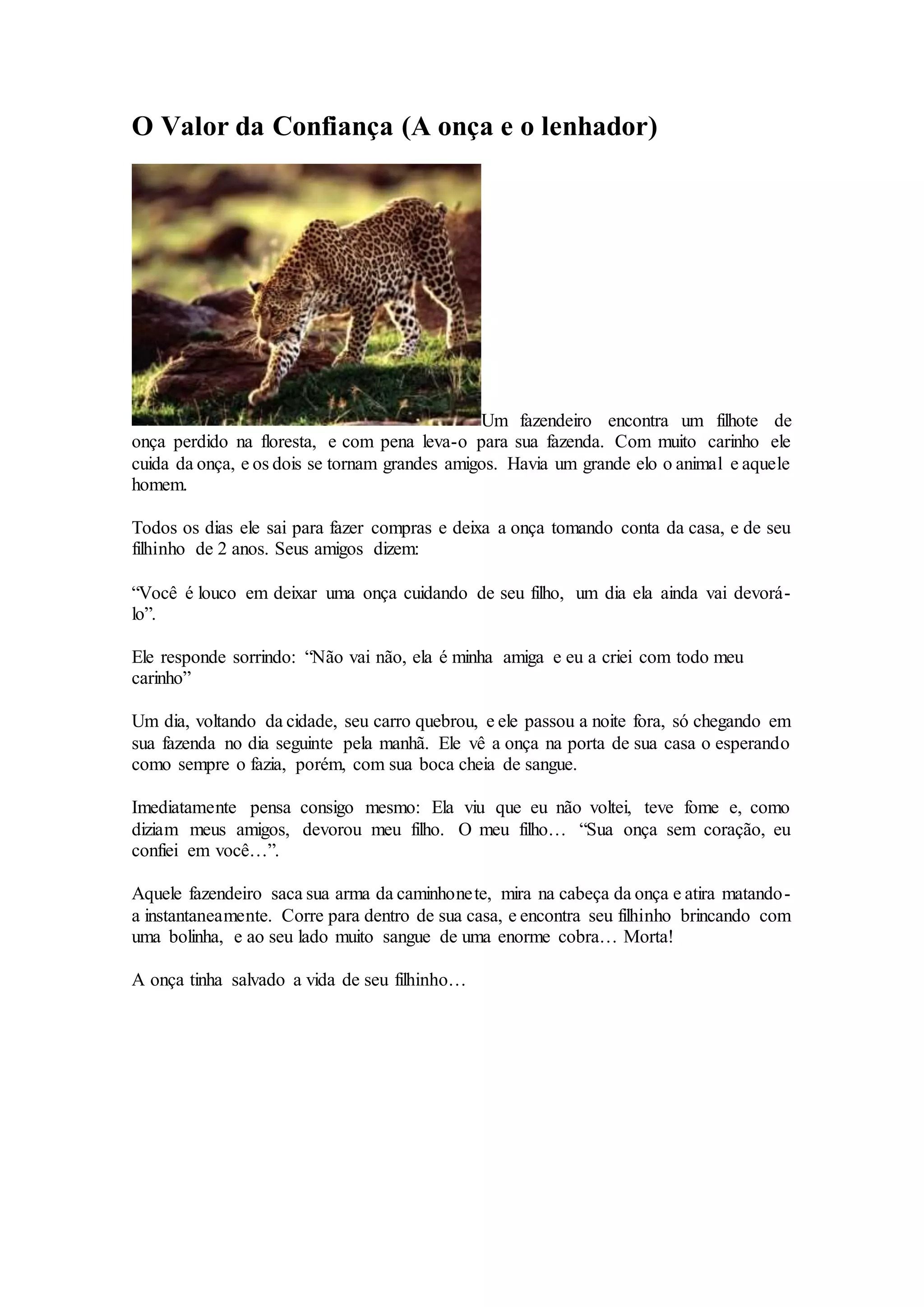 Um fazendeiro encontra e cria uma onça filhote. Anos depois, quando seu carro quebra e ele não volta para casa, seus amigos avisam que a onça pode atacar seu filho. Ao chegar em casa, ele vê a onça com sangue na boca, pensando que ela matou seu filho. Porém, na verdade a onça havia salvado o menino de uma cobra.