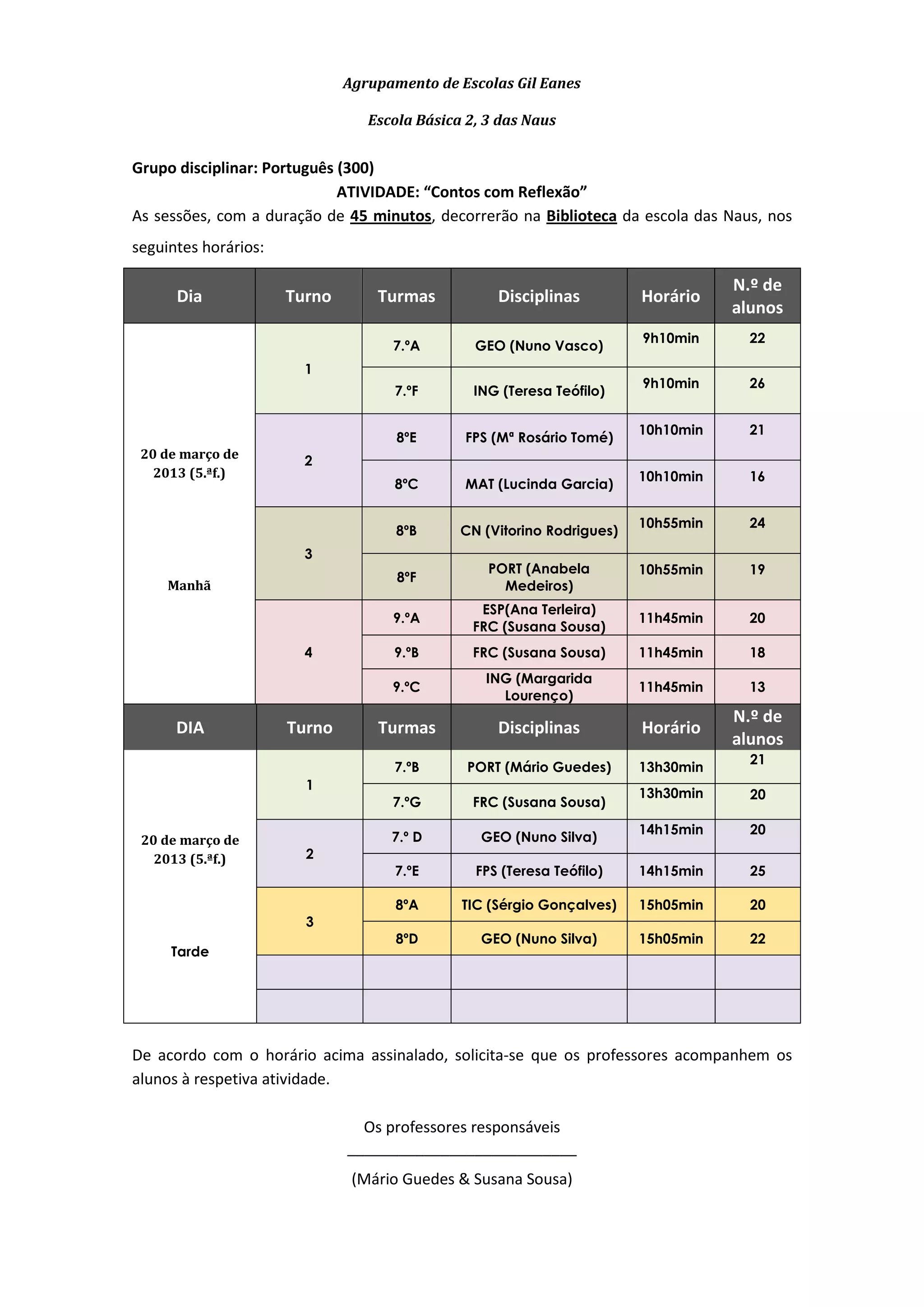 O documento apresenta um cronograma para a atividade "contos com reflexão" da Escola Básica 2, 3 das Naus, com sessões programadas na biblioteca da escola em diferentes horários. Os alunos serão acompanhados por professores designados, conforme listado. A atividade ocorrerá em 20 de março de 2013, com a participação de várias turmas e disciplinas.