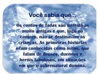 Os contos de fadas surgiram como narrativas para explicar fenômenos naturais, não eram destinados às crianças. Ao longo do tempo, as histórias foram adaptadas para ajudar na educação das crianças, que gostavam das fantasias. Os contos de fadas existem há milhares de anos e contribuem para a formação e aprendizagem infantil ao despertar a curiosidade e o imaginário.