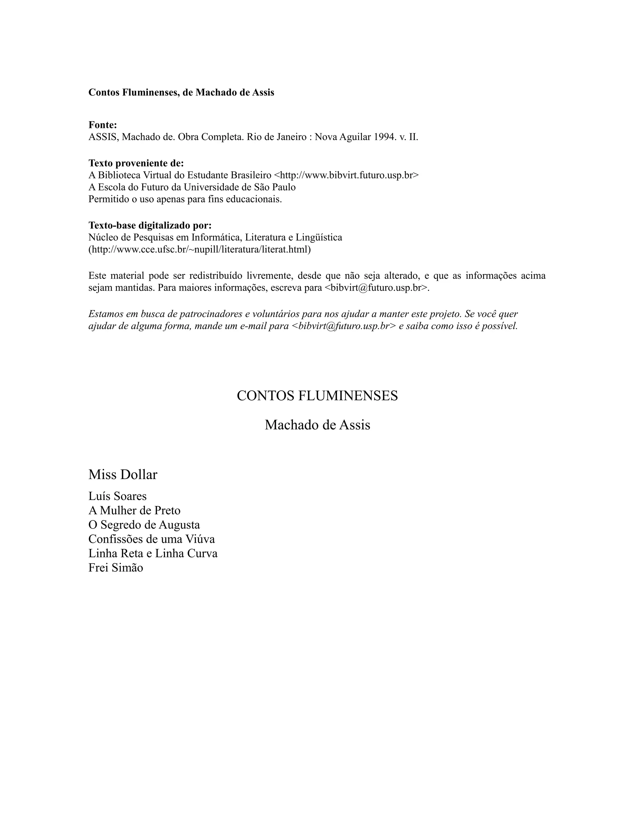 Contos Fluminenses é uma coleção de contos de Machado de Assis. O primeiro conto, Miss Dollar, introduz a cadela Miss Dollar que foge de casa e é encontrada por Dr. Mendonça, um colecionador de cães. Ele decide devolver Miss Dollar quando vê um anúncio oferecendo recompensa. Dr. Mendonça leva Miss Dollar de volta para sua verdadeira casa.