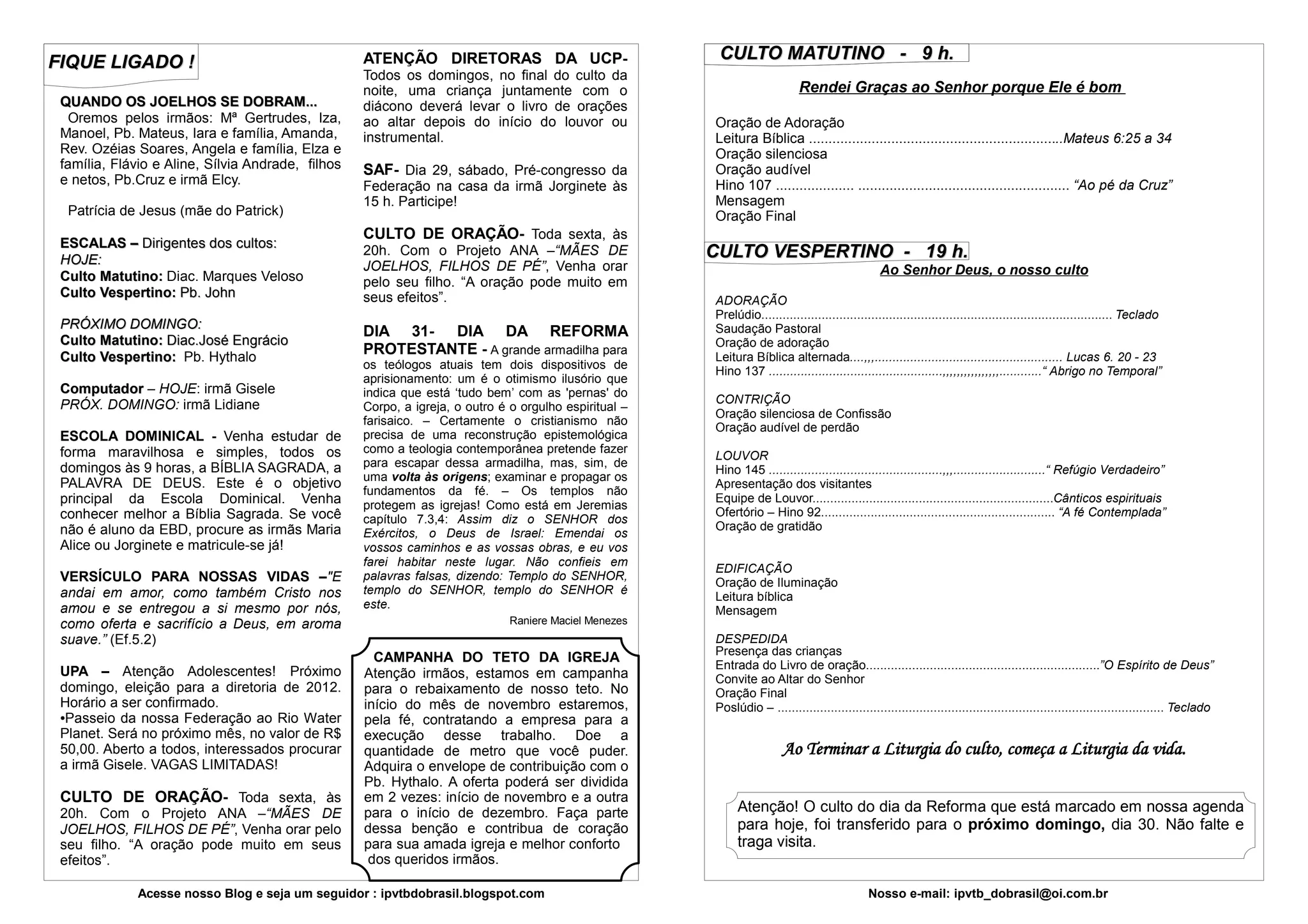 3) O culto comemorativo do dia da Reforma Protestante, marcado para hoje, foi transferido para o próximo domingo.