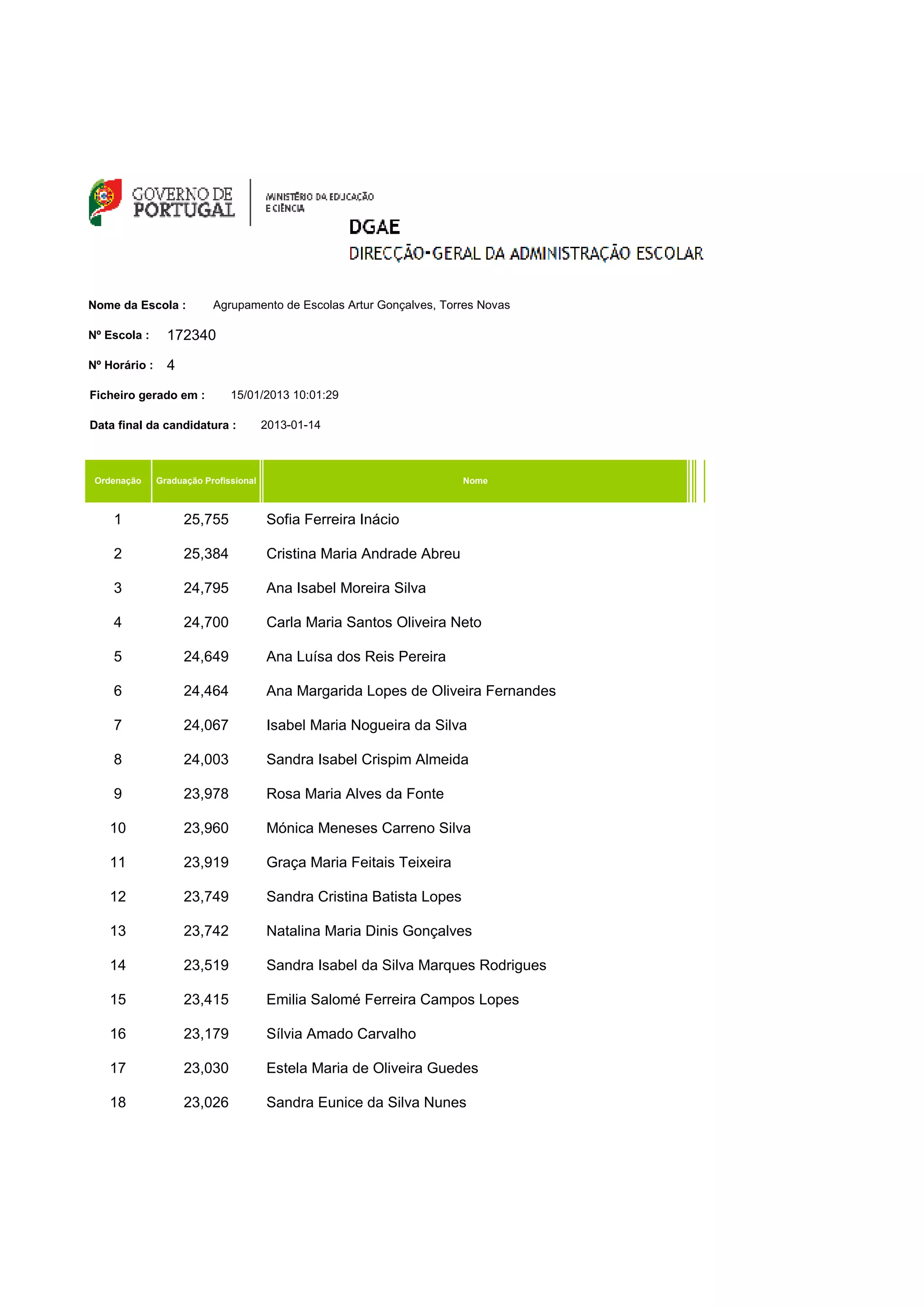 Este documento apresenta uma lista classificada de 206 candidatos a uma vaga em uma escola portuguesa, com seus nomes e notas de graduação profissional variando de 25,755 a 12,218 pontos. A lista inclui informações como o nome da escola, data de geração do documento e prazo final para candidatura.