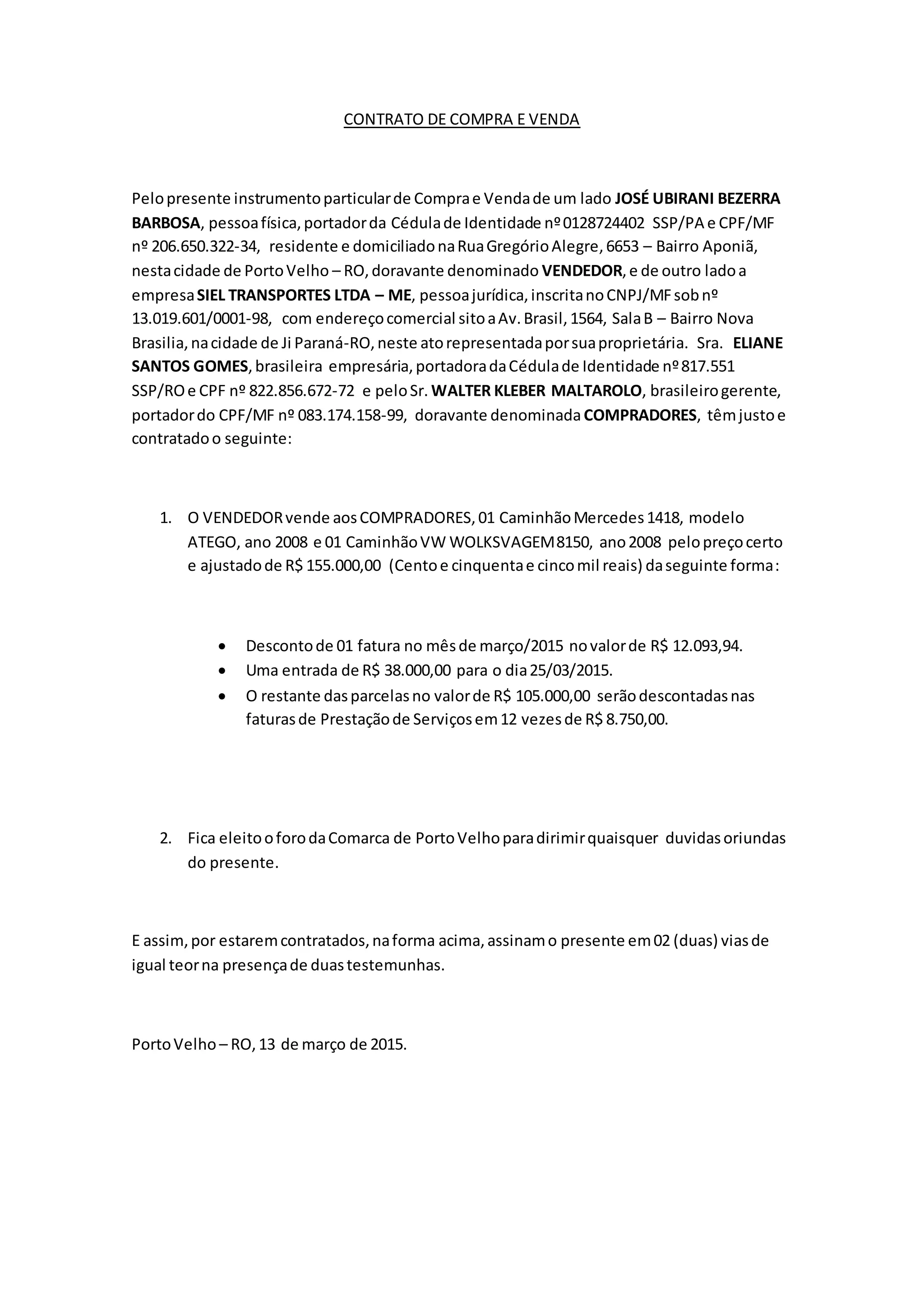 O documento é um contrato de compra e venda de dois caminhões entre José Ubirani Bezerra Barbosa como vendedor e a empresa SIEL Transportes LTDA como compradora. O valor total da venda é de R$ 155.000,00, que será pago com um desconto inicial, uma entrada e o saldo parcelado em 12 vezes nas faturas de prestação de serviços. O foro da Comarca de Porto Velho foi eleito para dirimir eventuais dúvidas sobre o contrato.
