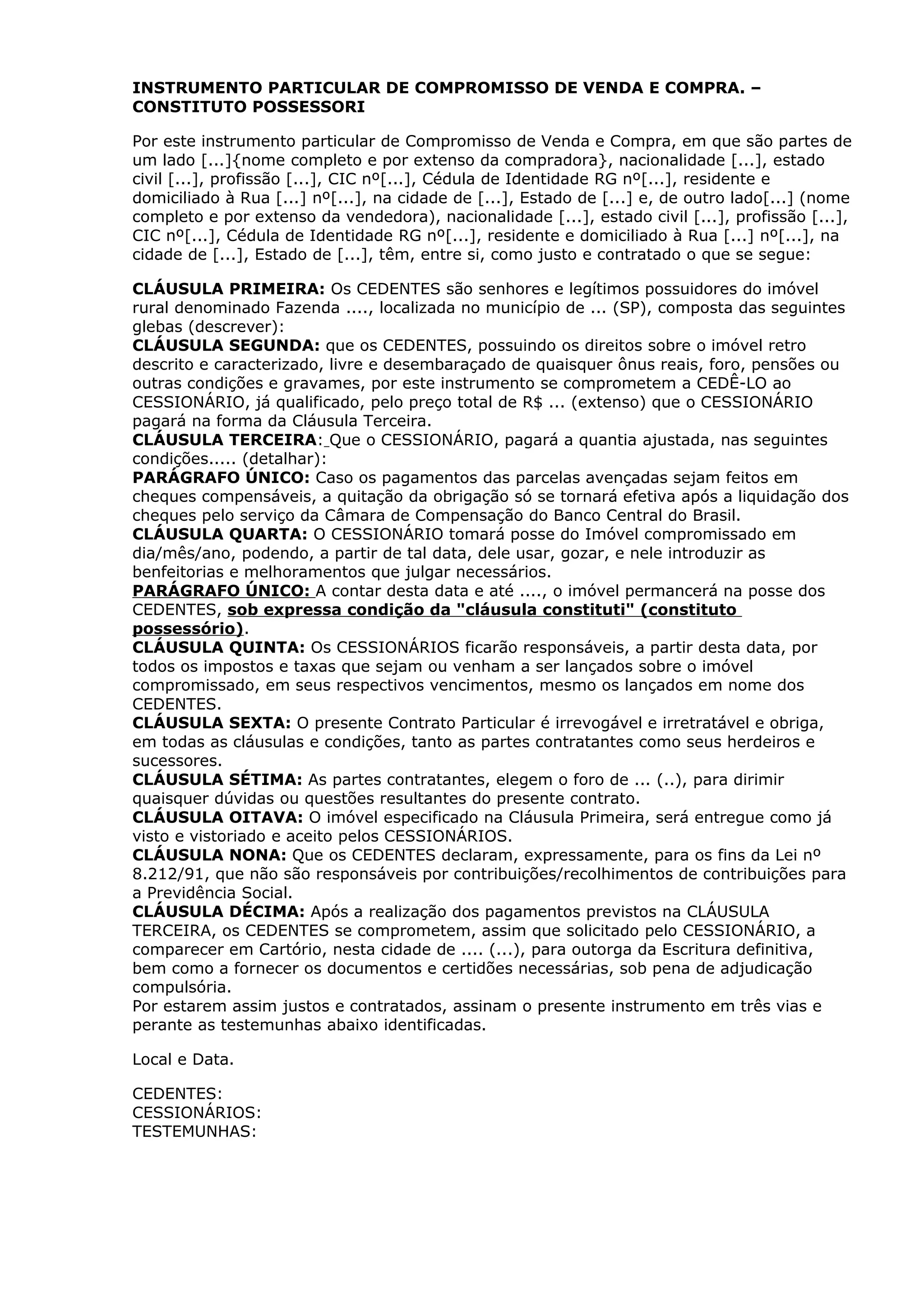 Este documento é um compromisso de venda e compra de uma fazenda rural entre um comprador e um vendedor. O vendedor se compromete a vender a fazenda descrita pelo preço total de R$ [valor extenso], que o comprador pagará em parcelas conforme detalhado. Após o pagamento das parcelas, o vendedor se compromete a fornecer a escritura definitiva da propriedade.