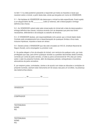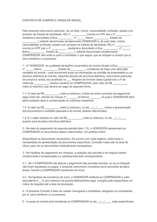 Este contrato descreve a venda de um imóvel pelo VENDEDOR para o COMPRADOR. O imóvel será vendido pelo valor total de R$[valor] a ser pago em três parcelas, sendo uma no ato da assinatura e as outras duas em datas futuras. O contrato especifica os documentos que o VENDEDOR deve fornecer e as consequências em caso de inadimplência do COMPRADOR.