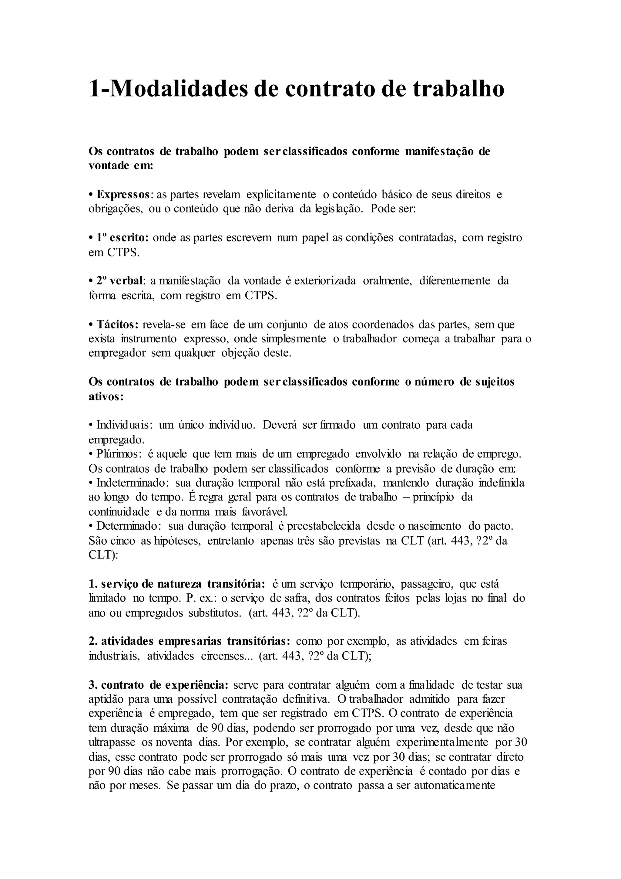 O documento discute diferentes modalidades de contratos de trabalho, incluindo sua classificação de acordo com a manifestação de vontade (expresso ou tácito), número de sujeitos (individual ou plurimo) e previsão de duração (determinado ou indeterminado). Também aborda a rescisão do contrato de trabalho, jornada de trabalho, cartão de ponto, horas de sobreaviso, diferença entre salário e remuneração e valor de R$ 4.500,00.