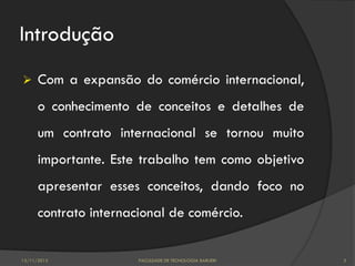 O documento discute os conceitos e características dos contratos internacionais de comércio, incluindo suas principais cláusulas e formas de resolução de disputas. Aborda tópicos como a formação dos contratos, direito aplicável, tipos de cláusulas, incoterms, eleição de foro e arbitragem internacional.