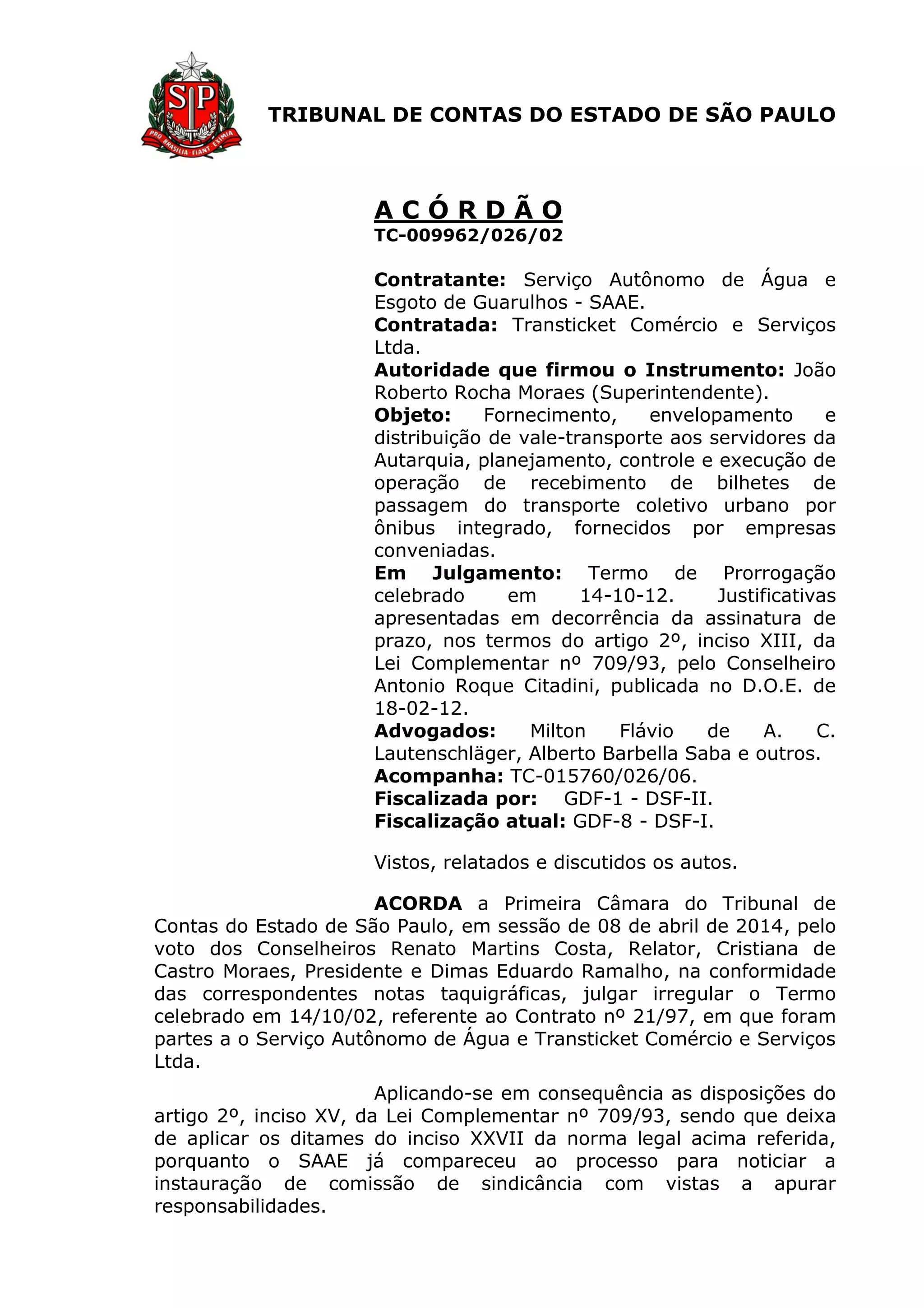 O Tribunal de Contas julgou irregular um termo de prorrogação celebrado entre o Serviço Autônomo de Água e Esgoto de Guarulhos e a Transticket Comércio e Serviços Ltda. por não atender as normas legais. O Tribunal aplicou sanções previstas em lei e dispensou a aplicação de outras sanções, uma vez que o SAAE já havia iniciado processo para apurar responsabilidades pelo caso.