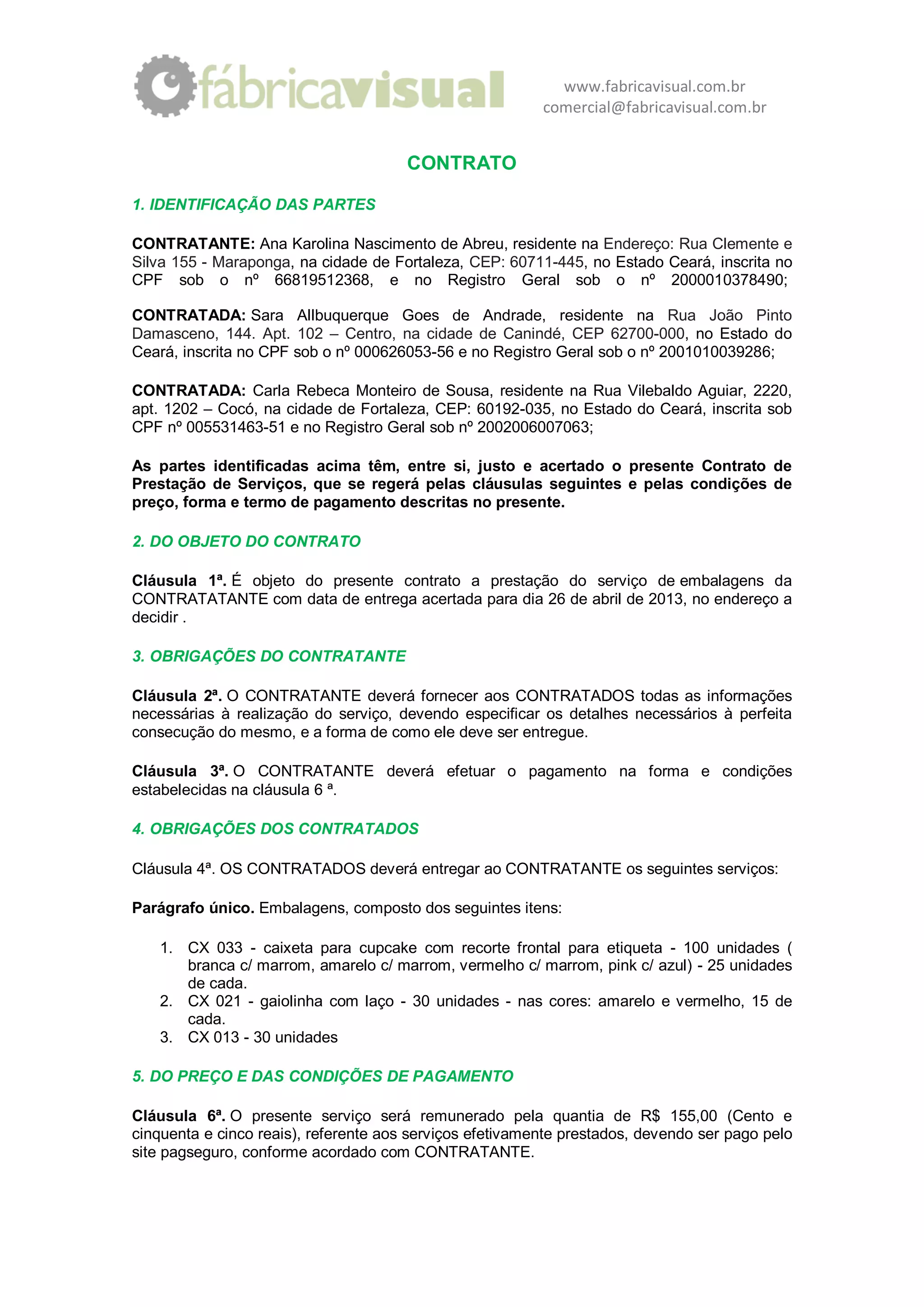 Este contrato define os termos de um acordo entre Ana Karolina Nascimento de Abreu e as contratadas Sara Albuquerque Goes de Andrade e Carla Rebeca Monteiro de Sousa para a prestação de serviços de embalagens. O contrato especifica as obrigações das partes, o preço de R$155,00 a ser pago pelo serviço e os termos para rescisão ou inadimplemento.