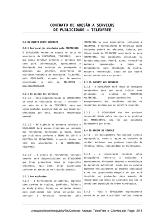 Este contrato estabelece os termos e condições para que pessoas físicas ou jurídicas se tornem divulgadores da TelexFree, uma empresa de marketing multinível. Os principais pontos são: 1) O divulgador terá acesso a ferramentas no site da TelexFree para divulgar produtos e serviços; 2) Não há vínculo empregatício, e o divulgador receberá comissões de acordo com seu desempenho; 3) Para ingressar, o divulgador deve pagar uma adesão e preencher um