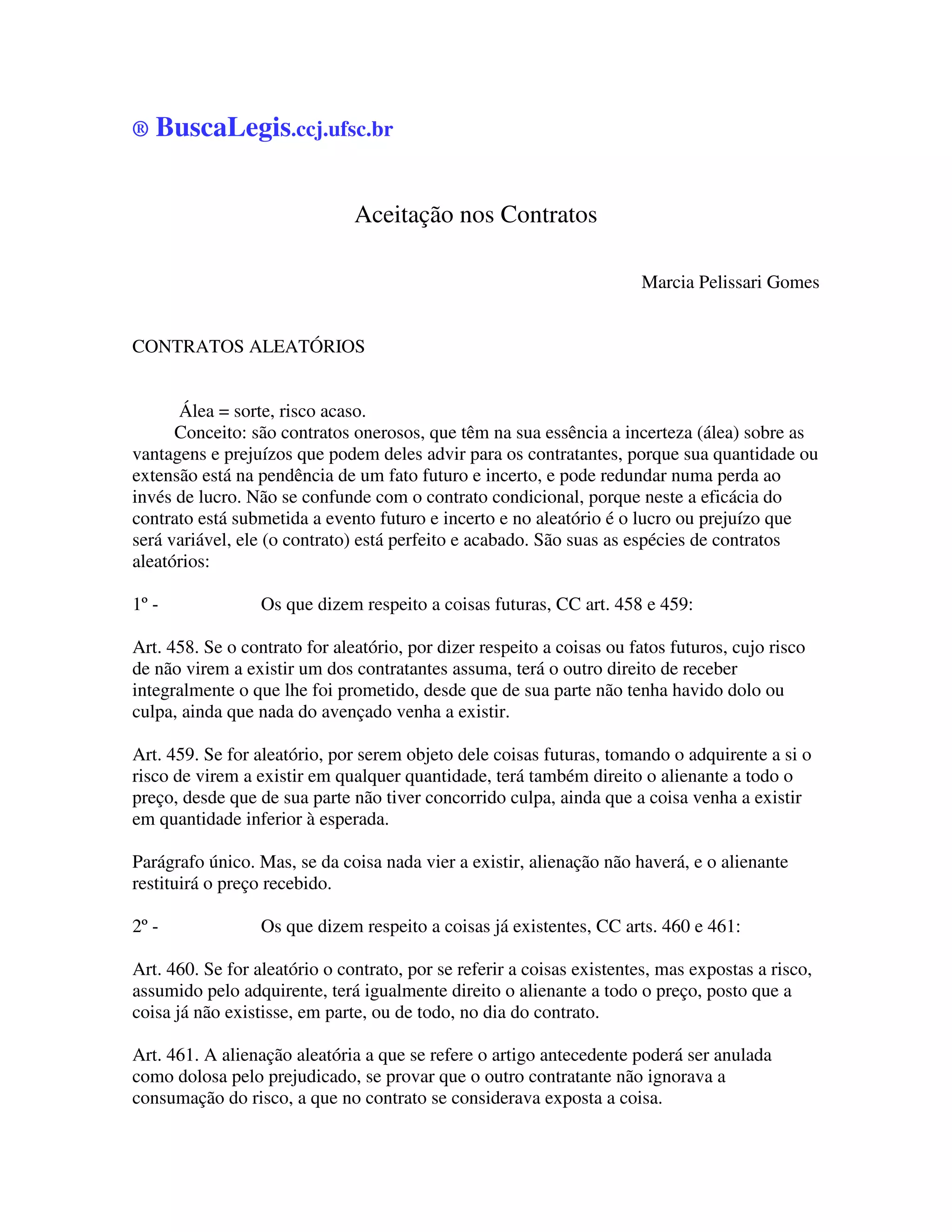 1) Contratos aleatórios são aqueles em que há incerteza sobre os resultados e podem resultar em lucro ou prejuízo para as partes. 2) Existem contratos aleatórios sobre coisas futuras ou já existentes, e o risco pode ser total ou parcialmente assumido pelas partes. 3) Contratos preliminares adiam a celebração de um contrato definitivo e exigem os mesmos requisitos essenciais deste, exceto quanto à forma.