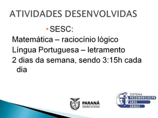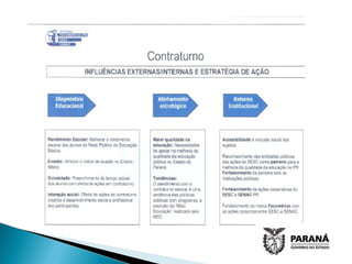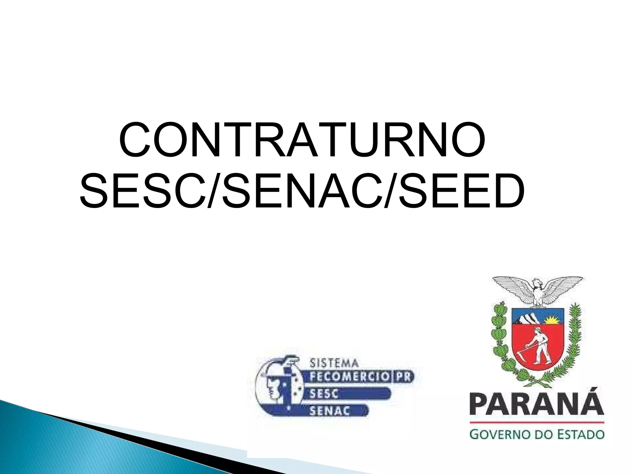 O documento propõe um programa de contraturno entre o SESC, SENAC e a Secretaria de Educação do Paraná para oferecer atividades aos alunos do ensino médio da rede pública com o objetivo de melhorar o rendimento escolar, diminuir a evasão e ocupar o tempo ocioso dos estudantes. O programa atenderia 2.550 alunos de 102 turmas em 19 cidades com aulas de oratória, comunicação, informação profissional e palestras sobre empregabilidade.