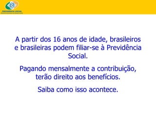 A partir dos16 anos de idade, brasileiros e brasileiras podem filiar-se à Previdência Social. Pagando mensalmente a contribuição, terão direito aos benefícios. Saiba como isso acontece.