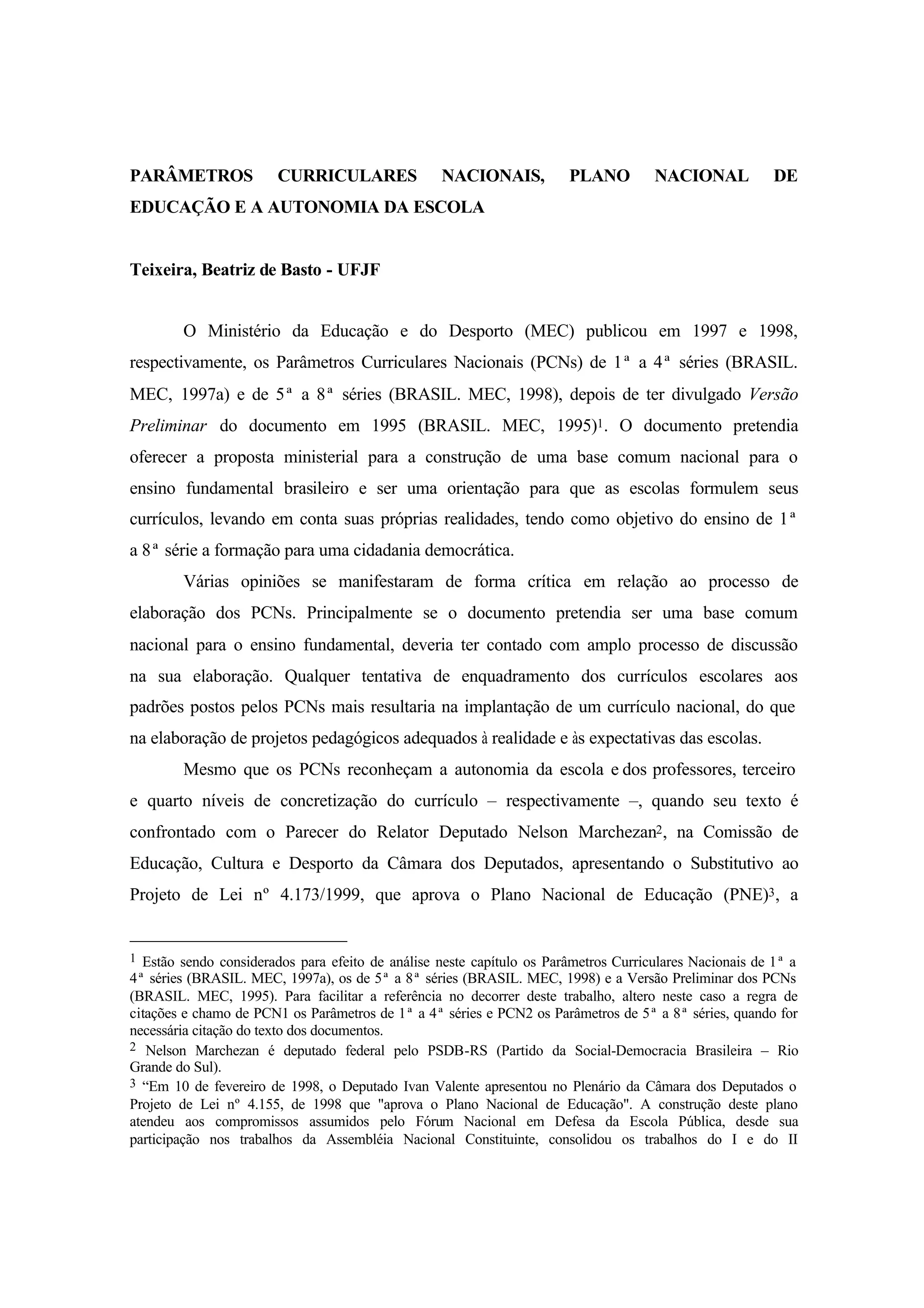 O documento discute a relação entre os Parâmetros Curriculares Nacionais, o Plano Nacional de Educação e a autonomia da escola no Brasil. Críticos argumentam que os PCNs foram elaborados rapidamente sem amplo debate e podem limitar a autonomia curricular das escolas. Por outro lado, o MEC defende que os PCNs visam estabelecer uma base comum nacional para a educação, respeitando as diferenças regionais e sem impor um projeto político único.
