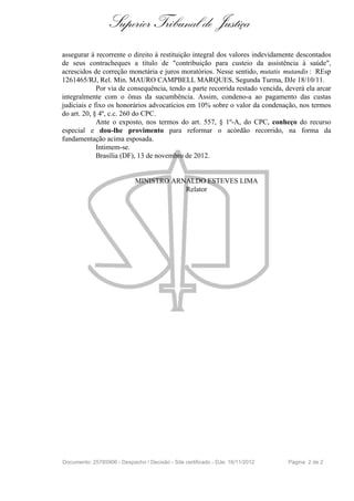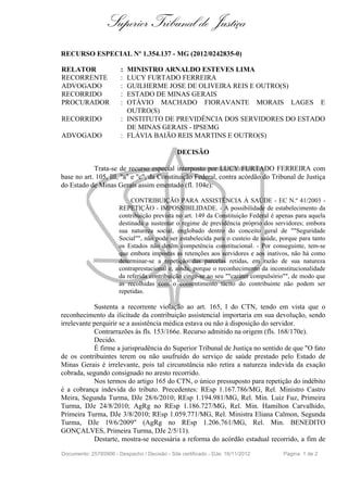 O documento é uma decisão do Superior Tribunal de Justiça sobre um recurso especial interposto por Lucy Furtado Ferreira contra o Estado de Minas Gerais e o Instituto de Previdência dos Servidores do Estado de Minas Gerais. O relator concedeu provimento ao recurso especial para reformar o acórdão recorrido e assegurar à recorrente o direito à restituição integral dos valores indevidamente descontados de seus contracheques a título de "contribuição para custeio da assistência à saúde", acrescidos de correção monetária e