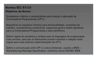 O documento fornece informações sobre controladores lógicos programáveis (CLP), incluindo sua estrutura básica, programação, endereçamento, tipos de variáveis, linguagens de programação, instruções booleanas, temporização e contagem. Aborda conceitos como entrada e saída digital e analógica, memória, temporizadores, contadores e programação de controladores Siemens S7-1200 no TIA Portal.