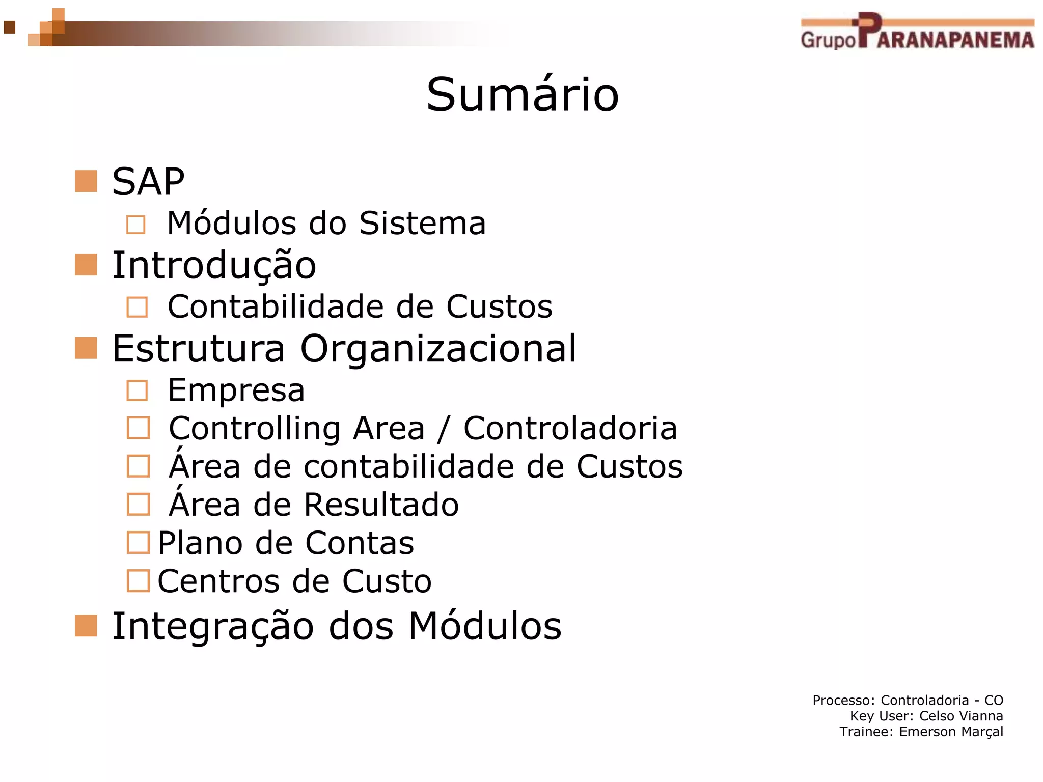 O documento descreve a estrutura organizacional da controladoria no SAP, incluindo a integração dos módulos, a área de contabilidade de custos, centros de custo e plano de contas.