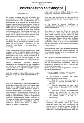 O documento discute como controlar as emoções de forma saudável de acordo com princípios bíblicos. Aborda especificamente a ira e a ansiedade, explicando que embora sejam normais, precisam ser controladas para não se tornarem prejudiciais. Oferece conselhos como pedir ajuda a Deus, entregar as situações a Ele, orar, manter pensamentos positivos e humildade.