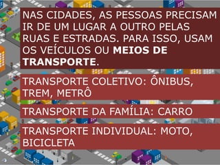 O documento discute como o transporte de pessoas e bens nas cidades causa poluição do ar devido aos gases emitidos pelos veículos a combustão. A Controlar realiza inspeções veiculares para medir e controlar os níveis de emissão, visando melhorar a qualidade do ar e a saúde pública.