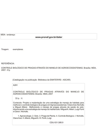 O documento apresenta estratégias de controle biológico de pragas em agroecossistemas utilizando o manejo da biodiversidade e a saúde do solo. Ele enfatiza a importância de incrementar a biodiversidade tanto acima quanto abaixo do solo para fortalecer as defesas naturais das plantas e promover um equilíbrio ecológico. Os autores, Clara Inês Nicholls e Miguel A. Altieri, propõem que práticas agroecológicas diversas são fundamentais para a sustentabilidade e produtividade na agricultura familiar.