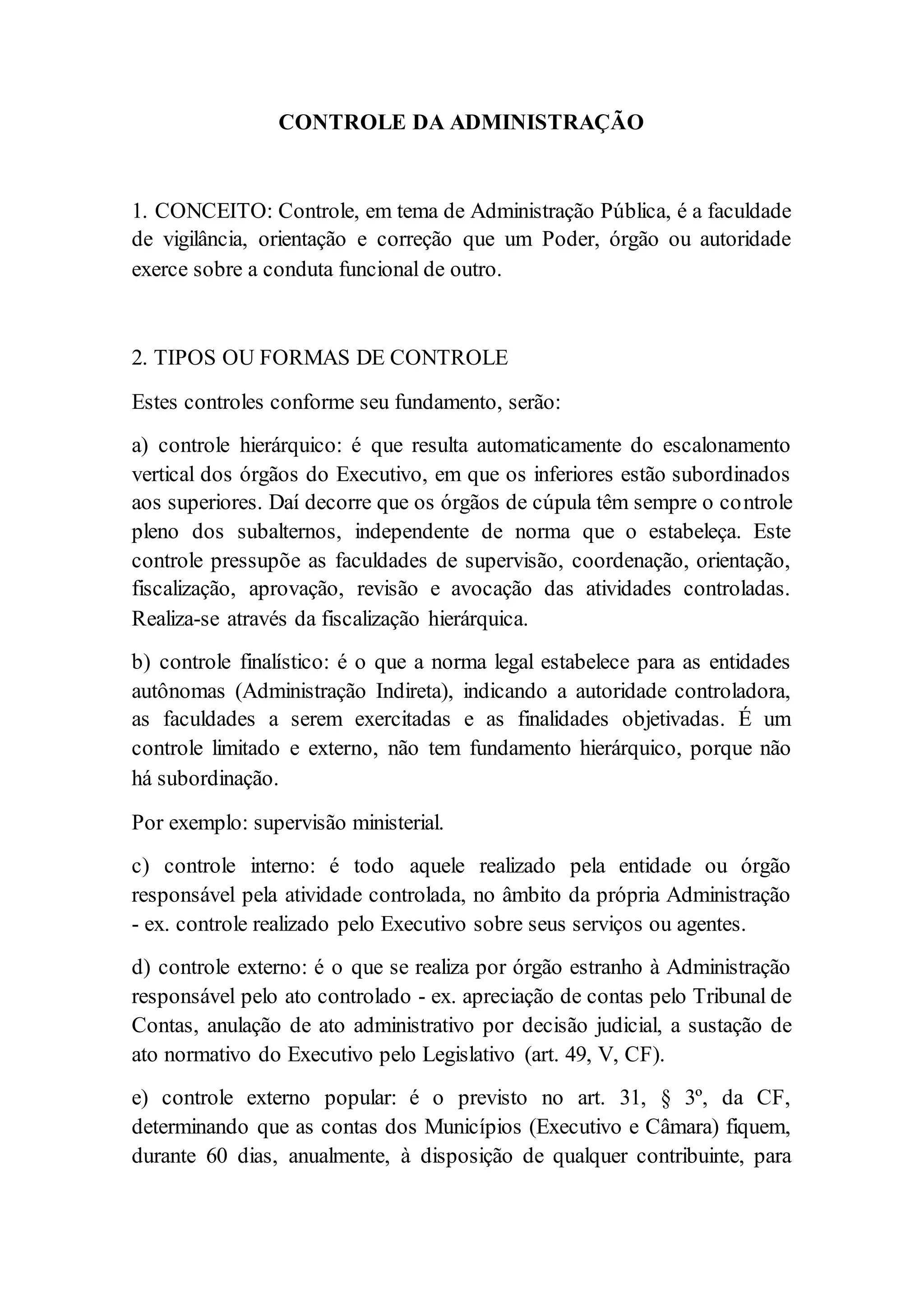 O documento discute os diferentes tipos de controle da administração pública, incluindo: controle hierárquico, finalístico, interno, externo e popular. Também aborda controle preventivo, concomitante, subsequente, de legalidade e mérito. Finalmente, descreve o controle administrativo, legislativo e judiciário, com exemplos de cada um.