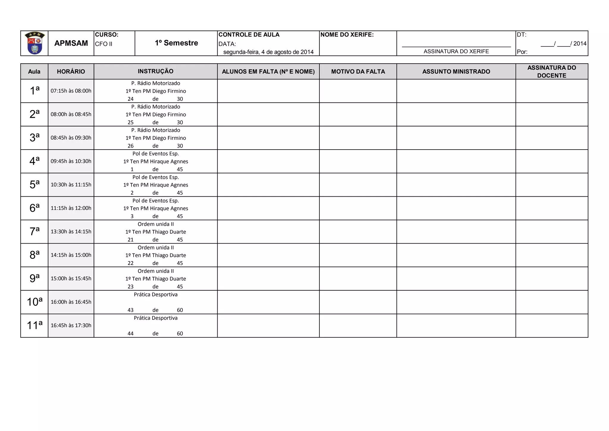 CURSO: CONTROLE DEAULA NOME DO XERIFE: DT: