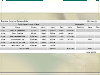 O documento discute o que são contas a pagar e a importância do controle dessas contas. Explica que contas a pagar são despesas que uma empresa ou pessoa tem que pagar regularmente, como contas de luz, aluguel e salários. O controle dessas contas permite antecipar os pagamentos e evitar atrasos e juros. Também mostra como calcular juros com base no capital, taxa e tempo.