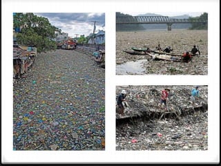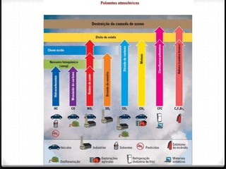 O documento discute as causas e efeitos da poluição do ar, identificando as principais fontes como indústrias, transportes e queima de lixo. Também aborda os principais poluentes e como a poluição afeta a saúde humana, animais e vegetais. Finalmente, fornece medidas para o controle da poluição, como equipamentos de retenção e melhorias no transporte público.