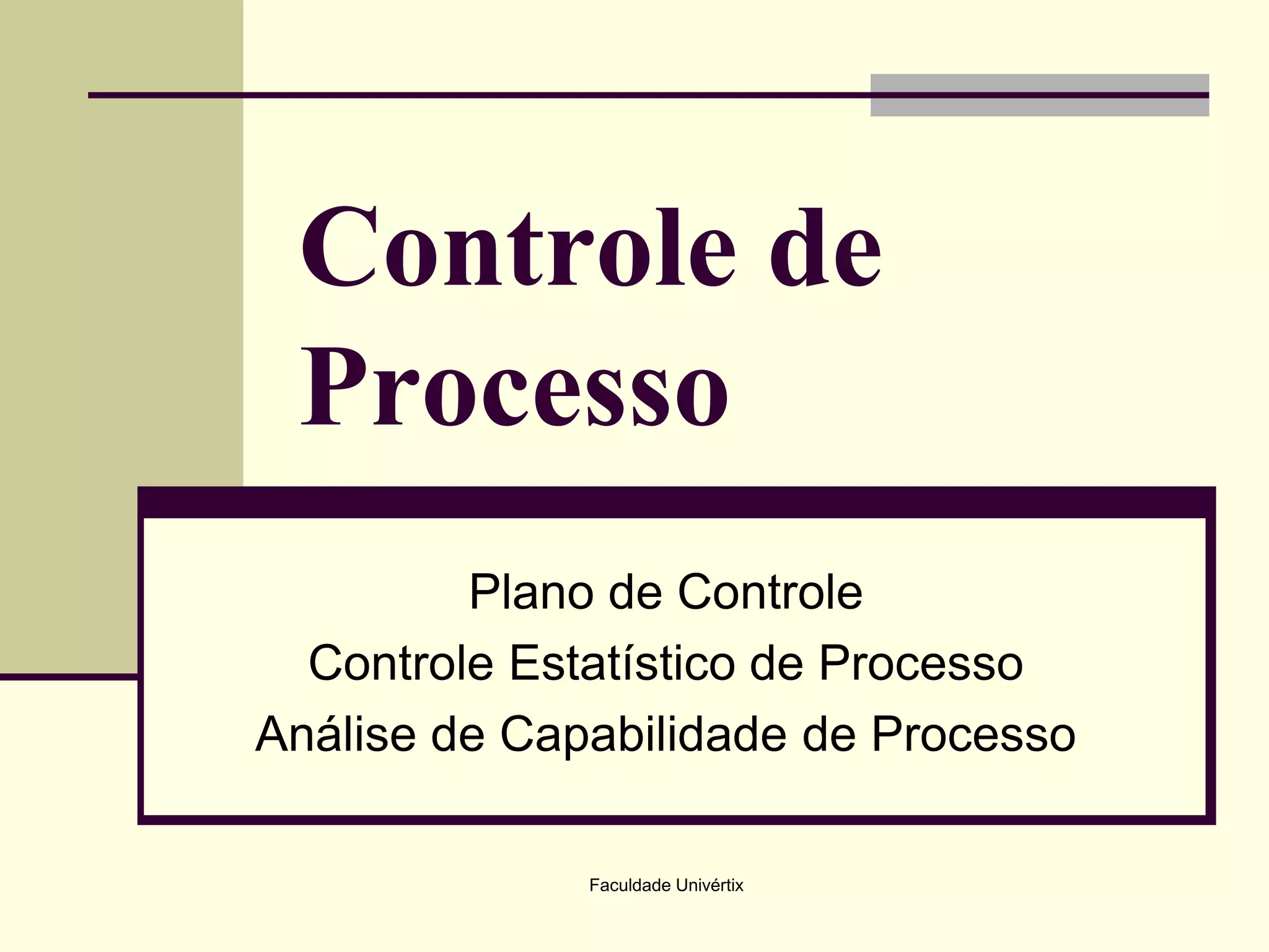 O documento apresenta três tópicos principais sobre controle de processo: (1) Plano de Controle, que descreve como derivar controles a partir de um FMEA e incluir técnicas à prova de erro; (2) Controle Estatístico de Processo, que introduz conceitos como variação, causas comuns e especiais, e cartas de controle; (3) Análise de Capabilidade de Processo, que explica como medir a capacidade de um processo atender especificações usando índices como Cp e Cpk.