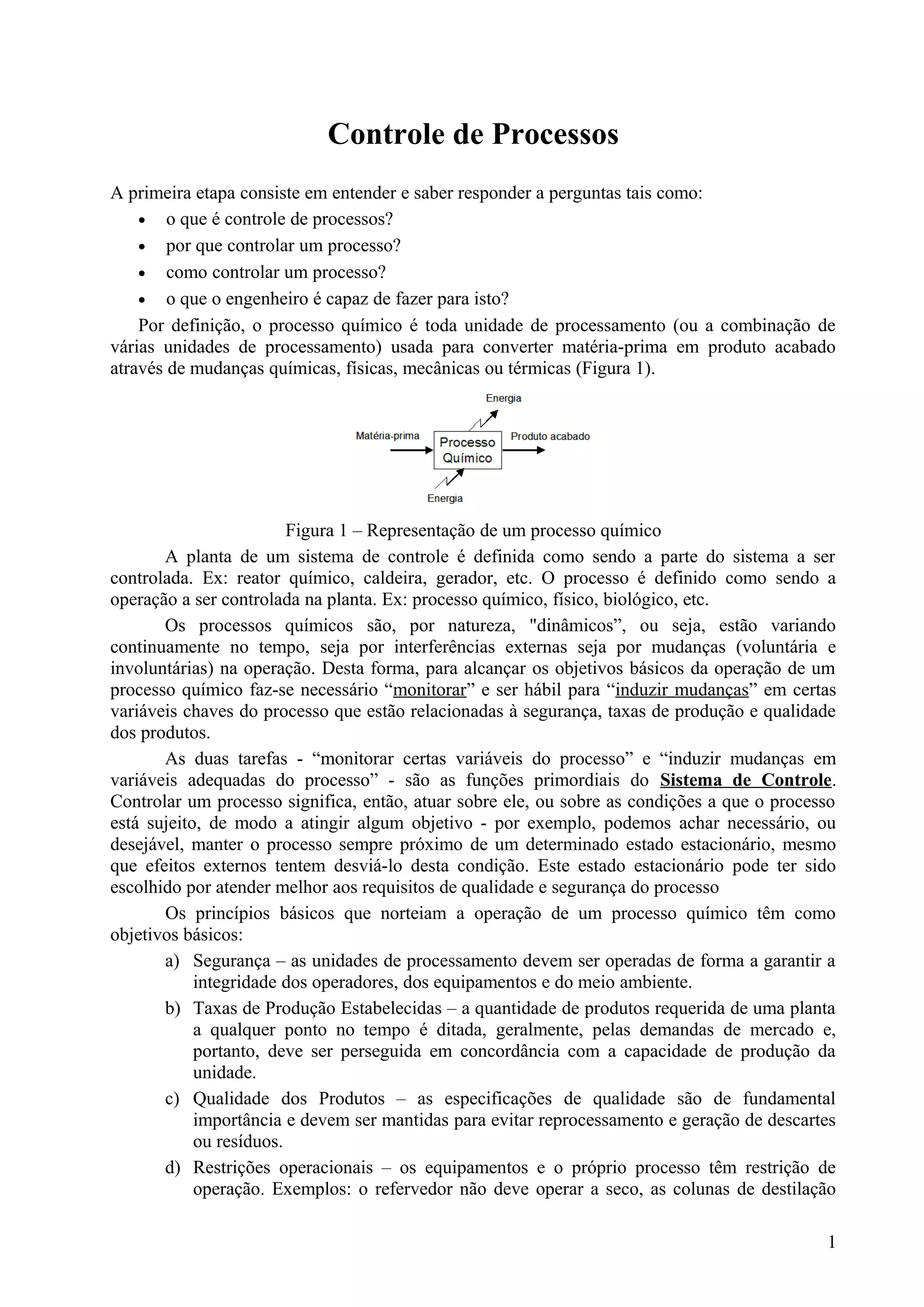 O documento discute controle de processos químicos, definindo o que é um processo químico e porque é importante controlá-lo. Explica que o controle envolve monitorar variáveis-chave de um processo e induzir mudanças nelas para garantir segurança, taxa de produção e qualidade, dentro de restrições operacionais. Também discute tipos de controle como manual, automático e auto-operado.