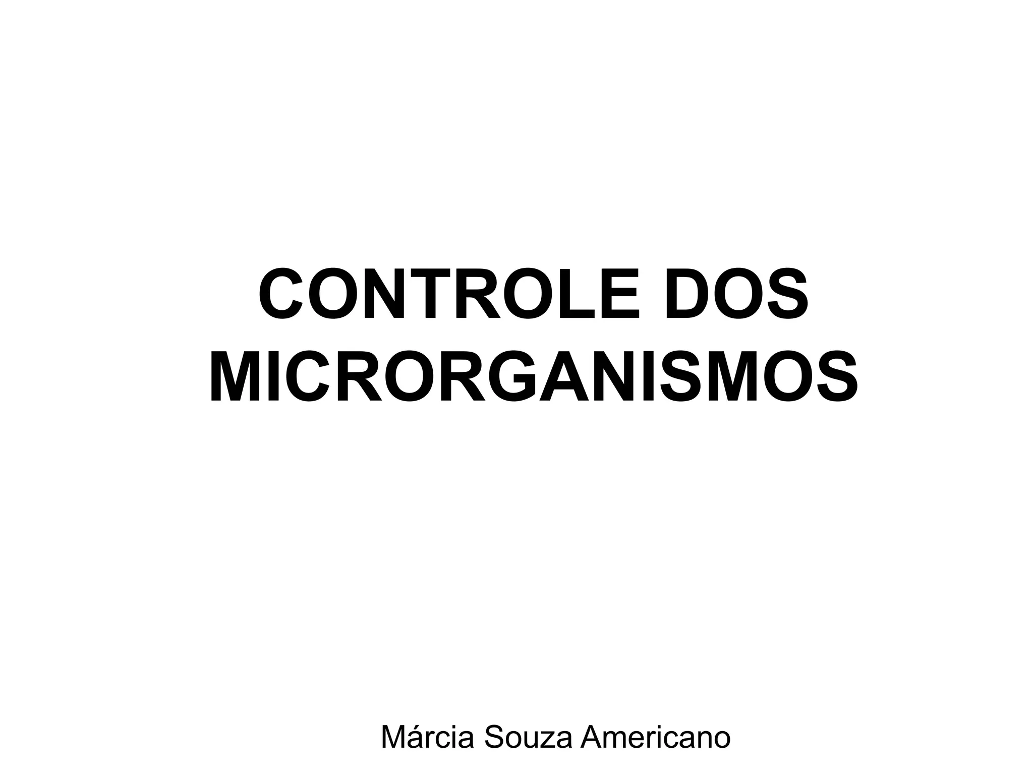 O documento discute os diferentes métodos de controle de microrganismos, incluindo esterilização, desinfecção e antimicrobianos. Define termos como esterilização, desinfecção, assepsia e classifica os antimicrobianos de acordo com sua origem, ação e espectro. Explica como diferentes antimicrobianos agem em nível celular, interferindo na parede, membrana, síntese proteica e DNA microbianos.