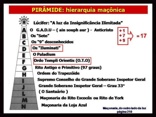 O documento discute como sociedades secretas como maçons, jesuítas e satanistas têm se infiltrado em diversas instituições para obter controle sobre as pessoas, muitas vezes de forma sutil através do entretenimento. Também descreve a hierarquia do ocultismo, com Lúcifer no topo controlando várias organizações para influenciar a humanidade antes do retorno de Cristo.