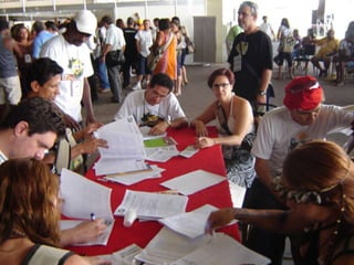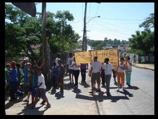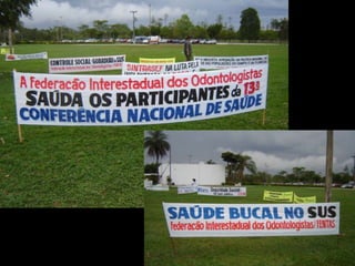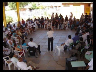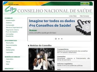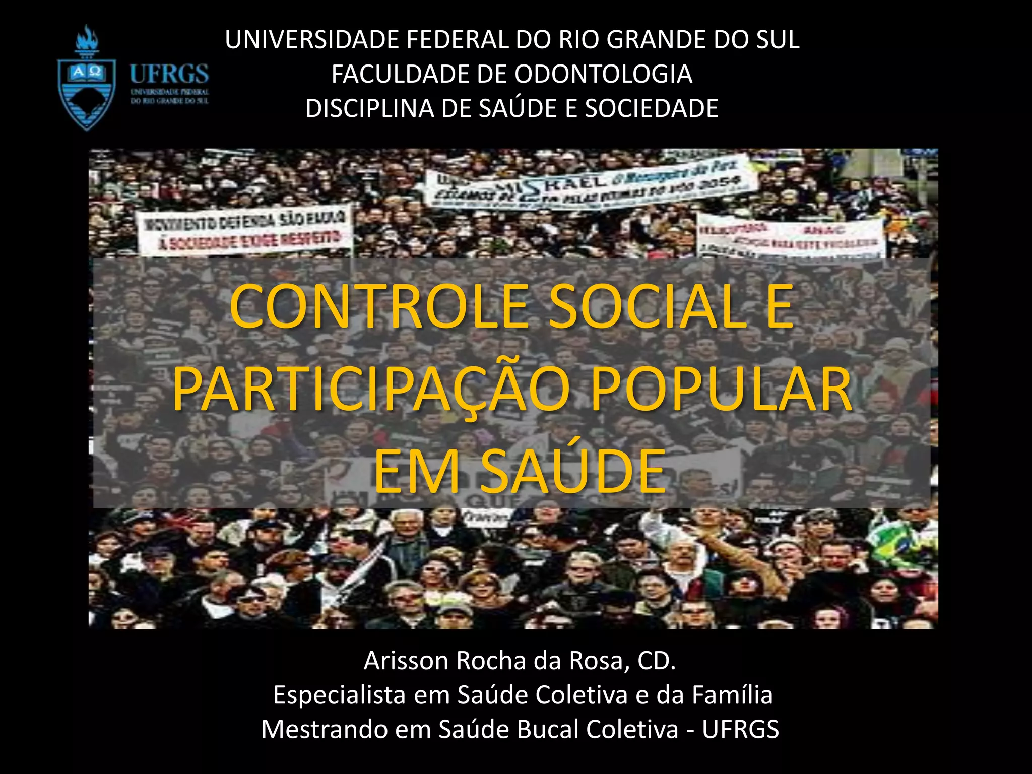 O documento discute a participação popular e o controle social no sistema de saúde brasileiro. Resume como a participação comunitária e popular surgiu na década de 1970 em resposta às limitações do modelo de saúde da previdência social e como foi institucionalizada no SUS por meio das conferências e conselhos de saúde na década de 1980. Também define o que é controle social em saúde e como ele se manifesta através da proposição, fiscalização e execução de políticas de saúde.